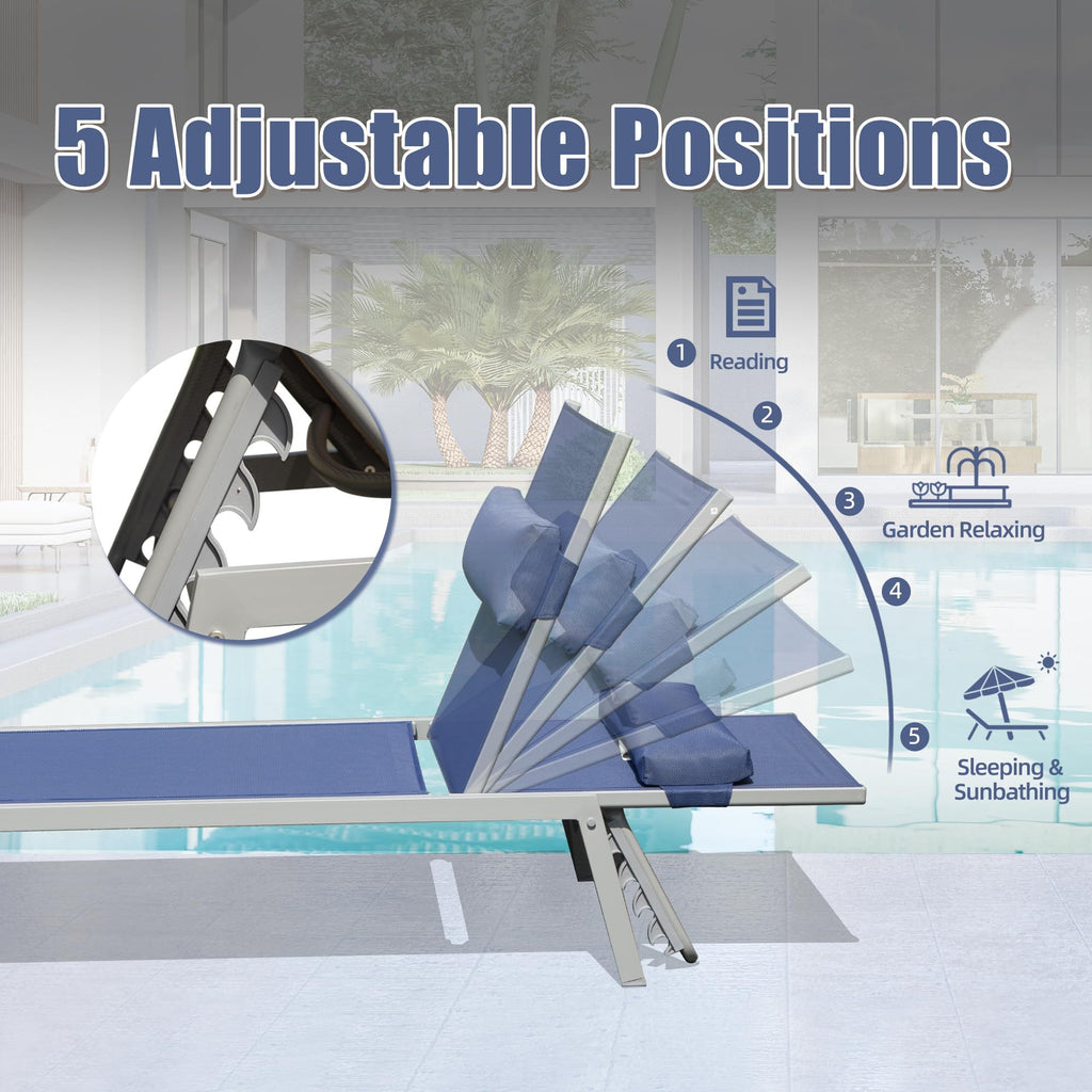 - 5 Adjustable Positions-- The aluminum chaise lounges have 5 levels of reclining options, you can effortlessly find your ideal lounging position, whether it's for dining, reading, or complete relaxation.