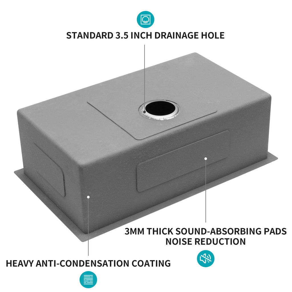 - [Coating and Silencer Pad]There is a thick coating on the outside of the sink to prevent condensation caused by weather changes. In addition, the 3mm thick rubber silencer pad can greatly reduce the noise from the faucet and give you a quieter cooking environment.