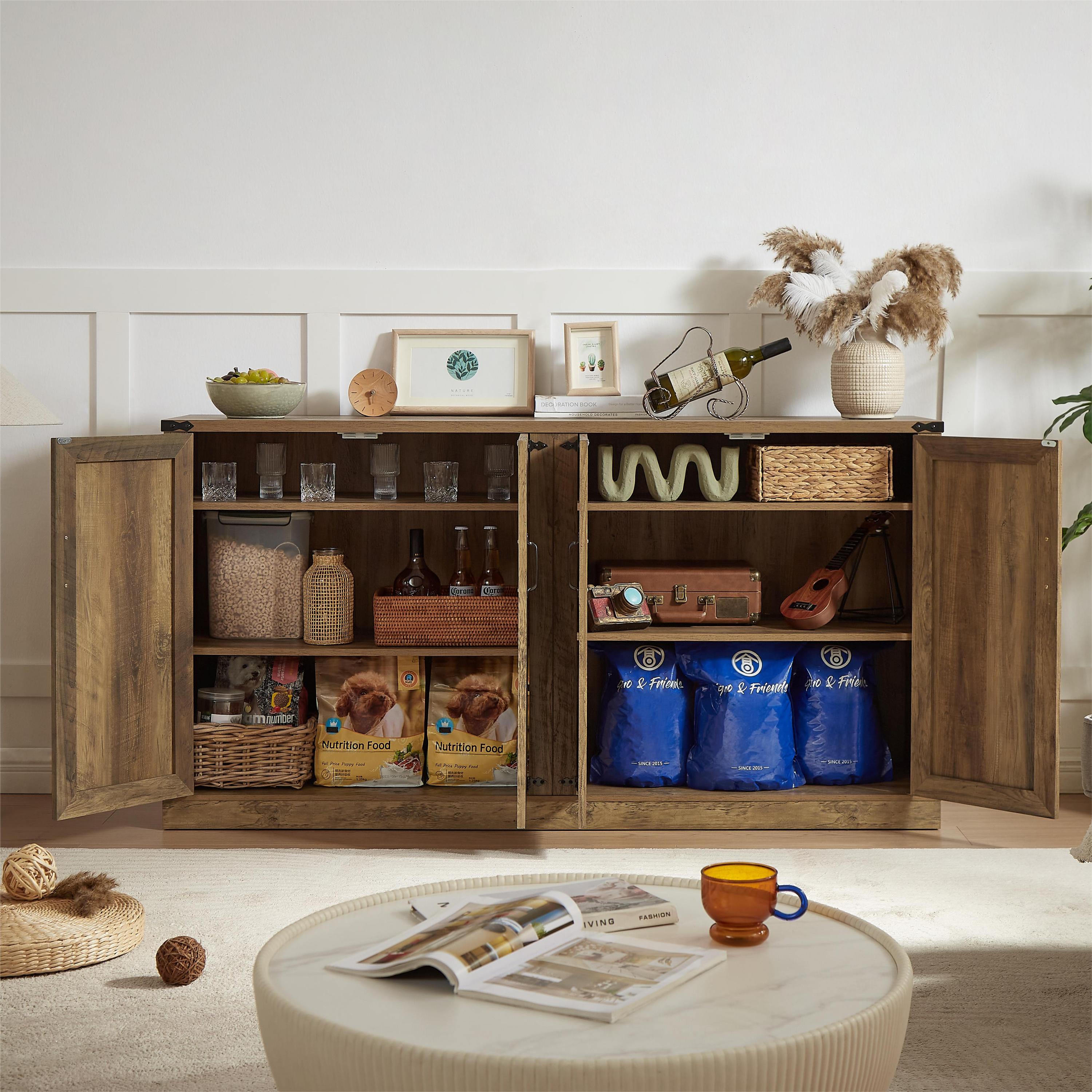 - EXTRA LARGE STORAGE SPACE: 65'*15.75'*34', this sideboard provides you with the perfect storage solution. The sturdy tabletop can be used for everything from vases, photos, and even a TV. The interior of the cabinet has three levels of storage space, one of which is a removable shelf, which can be used to store anything according to your needs, such as cutlery, canned goods, or books, snacks and other miscellaneous items, the removable shelves provide a solution for different storage needs.
