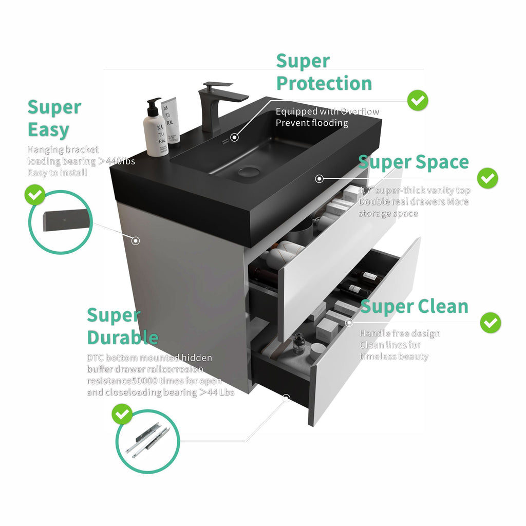 Introducing Alice, the epitome of modern elegance for your bathroom sanctuary. The Alice bathroom vanity is a stunning wall-mounted masterpiece designed to transform your space into a haven of sophistication. With its sleek matte black engineered stone basin and flawless white finish, Alice effortlessly exudes contemporary charm.
