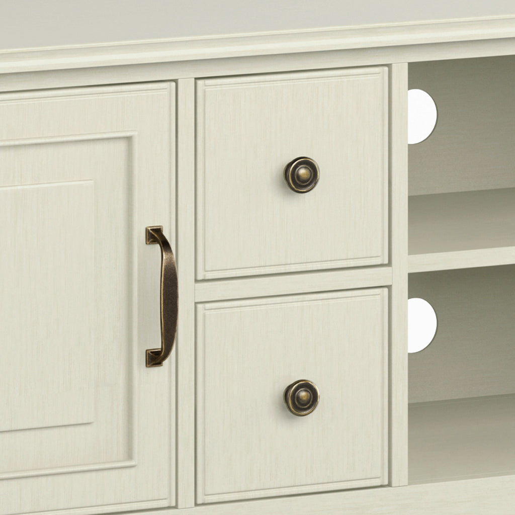 - Traditional style Includes vintage raised panel doors and drawers, notched legs, Bronze decorative hardware and metal drawer glides