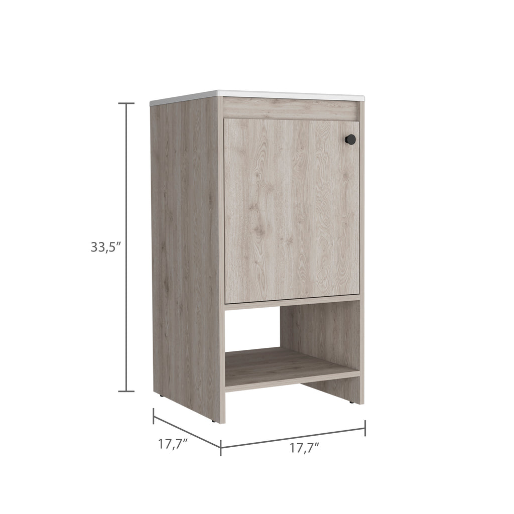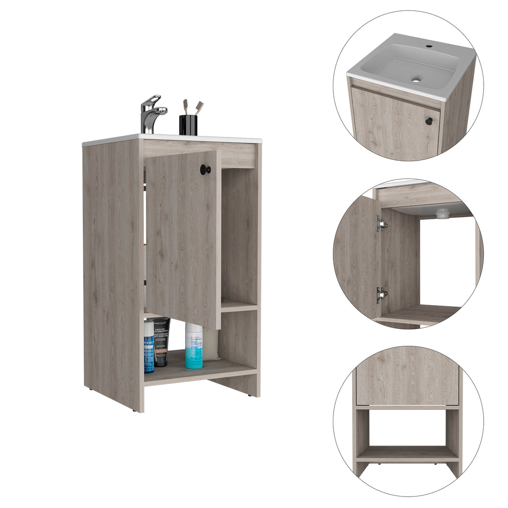 The free-standing bathroom vanity features a minimal and stylish design that fits seamlessly in any space. Made from durable reinforced resin, it includes one door, all-metal hardware, an open shelf, and a one-door cabinet for additional storage and flair.