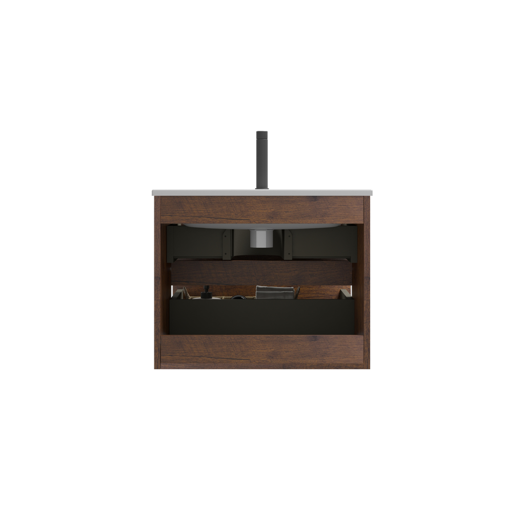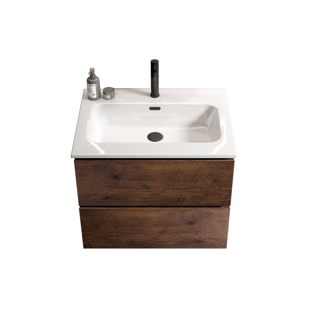 The double drawers maximize the use of space, offering a 20% increase in storage capacity to keep your bathroom essentials organized and within reach. And thanks to the DTC soft-closing silent drawer runners, you can enjoy a serene environment, free from disruptive noises. Featuring an integrated 45° sloping handle-free design, it embraces a minimalist approach to design. The sleek Walnut cabinet enhances the visual appeal and creates a seamless look, adding a touch of modern refinement to your bathroom.