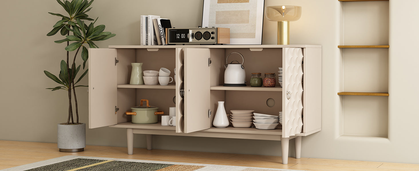 • Sufficient Capacity: Upgrade your storage with our versatile sideboard, featuring adjustable, removable shelves with shelves that can be set to one of three heights. This design offers ample capacity to store a variety of items, from bowls and plates to wine glasses and small appliances. Its customizable shelves ensure you can organize your space to fit your needs. With its flexible shelving and generous space, keeping your essentials neatly arranged. Shelf load capacity: 60 LBS.