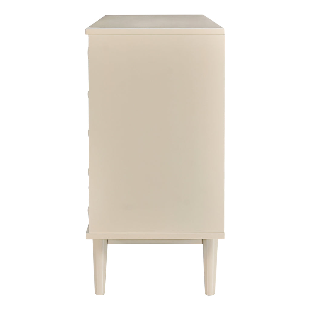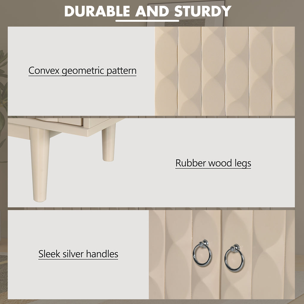 Elevate your space with our Modern Elegance Sideboard. Featuring a sleek, contemporary design, its cabinet doors boast a striking convex geometric pattern for added sophistication. Complemented by sleek silver handles, this sideboard seamlessly fits into any decor style, from minimalist to eclectic. With ample storage, it combines functionality with aesthetic appeal, making it a standout piece in any room.
