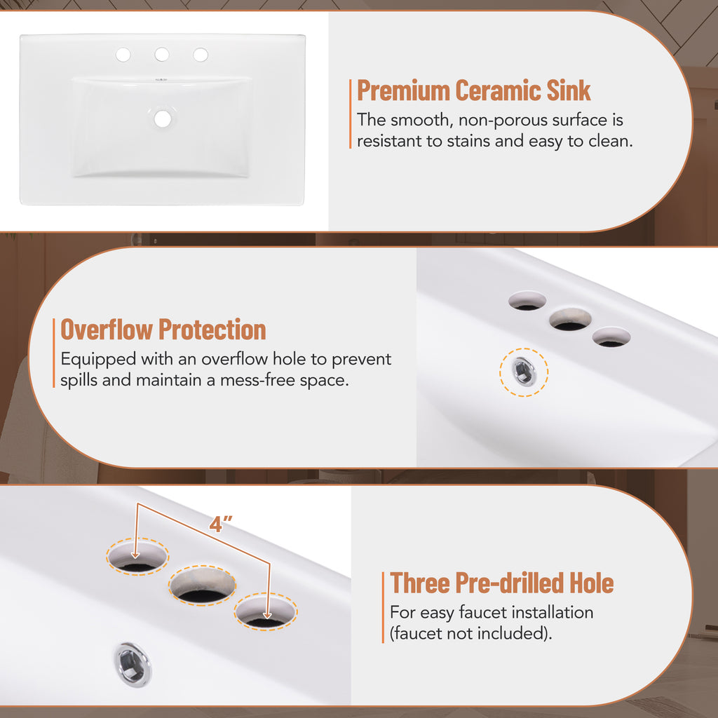 - Ceramic Sink: Paired with an inset ceramic sink, our vanity cabinet maximizes space efficiency. The pristine white ceramic sink not only enhances the aesthetic appeal but also offers a smooth surface that is easy to clean and maintain, preventing water stains effectively.