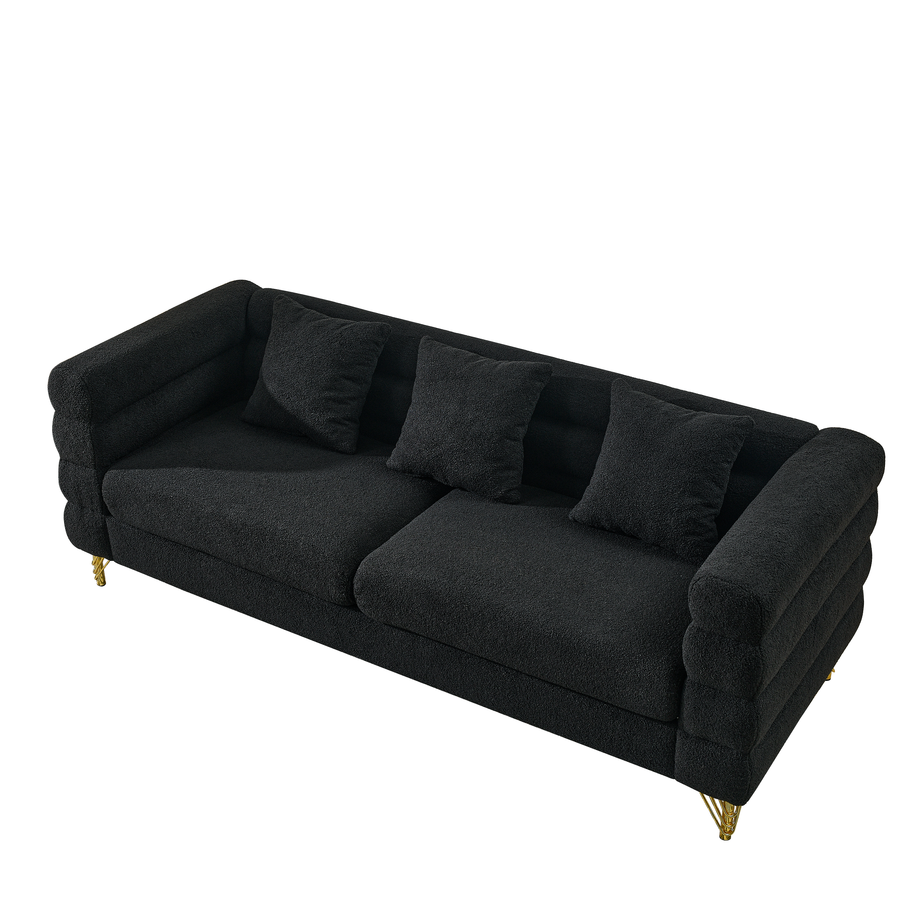 Carton quantity: 2 pcs. Product Name: three people sofa Three people sofa. DIMENSIONS. Please refer to the picture. Detailed Size. Please refer to the picture. Package Size. Please refer to description. Package Weight (lbs). Please refer to description. Product Weight (lbs). Please refer to description. Does this product include pillows: Three pillows. Weight Capacity: 250 lbs/seat. Assembly Required. Required (see instructions). Fabric Material: Teddy. Frame Material: Pine + Eucalyptus + Plywood: Pine + Eucalyptus + Plywood. Seat structure: Foam + spring pack. Upholstery: Cotton. Sofa foot material: metal and plastic. Place of Origin: China: China. Note: Manual measurement is used, there may be some reasonable error. All pictures are taken based on actual samples, there may be slight color difference due to light or monitor.