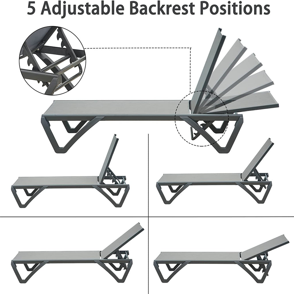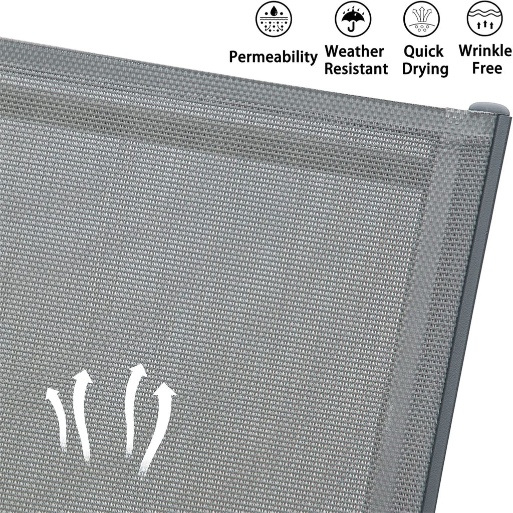 - High-Quality Material- This chaise lounge outdoor comes with sturdy aluminum frame and premium Texitilene fabric, which is durable and resistant to weather conditions. And the Texitilene fabric is a lightweight material that is breathable and quick dry, allows air to circulate and ventilates body heat on a hot day.