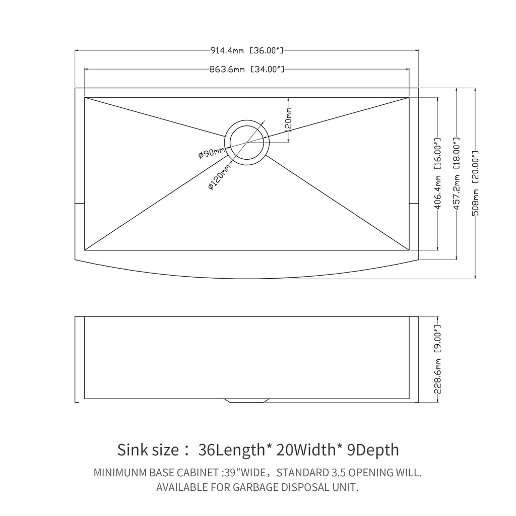 - [Dimensions] External Dimensions:36 x 20 x 9 inch, Internal dimensions: 34 x 16 inch. Minimum cabinet size is 39 inch. Standard 3.5' drain openings will fit any garbage disposal unit.