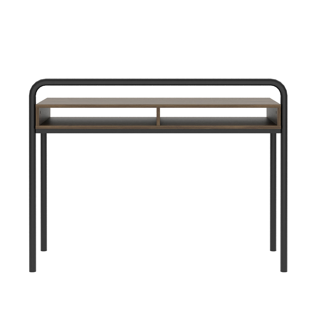 Techni Mobili Modern Classic Writing Desk offers an elegant look to any room as well as a mix of modern, classic, and industrial style. This item is sold separately or as part of the Allure Collection Set. The desktop is made of engineered wood with woodgrain Walnut finish, while the frame is made of powder coated painted steel. It features 2 under desktop open shelves, offering additional storage space for your daily office supplies.