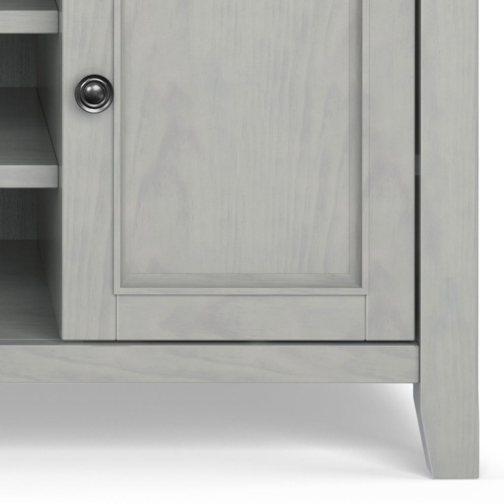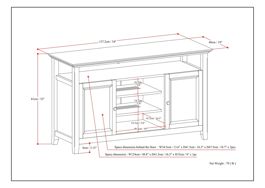 - Features two (2) side doors open to storage areas with two adjustable shelves and a central area with two (2) adjustable shelves and a top open shelf for your media devices.