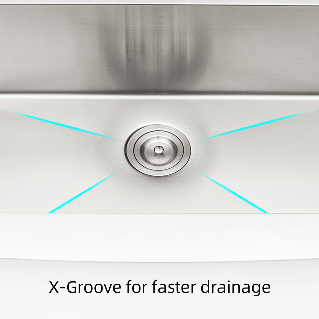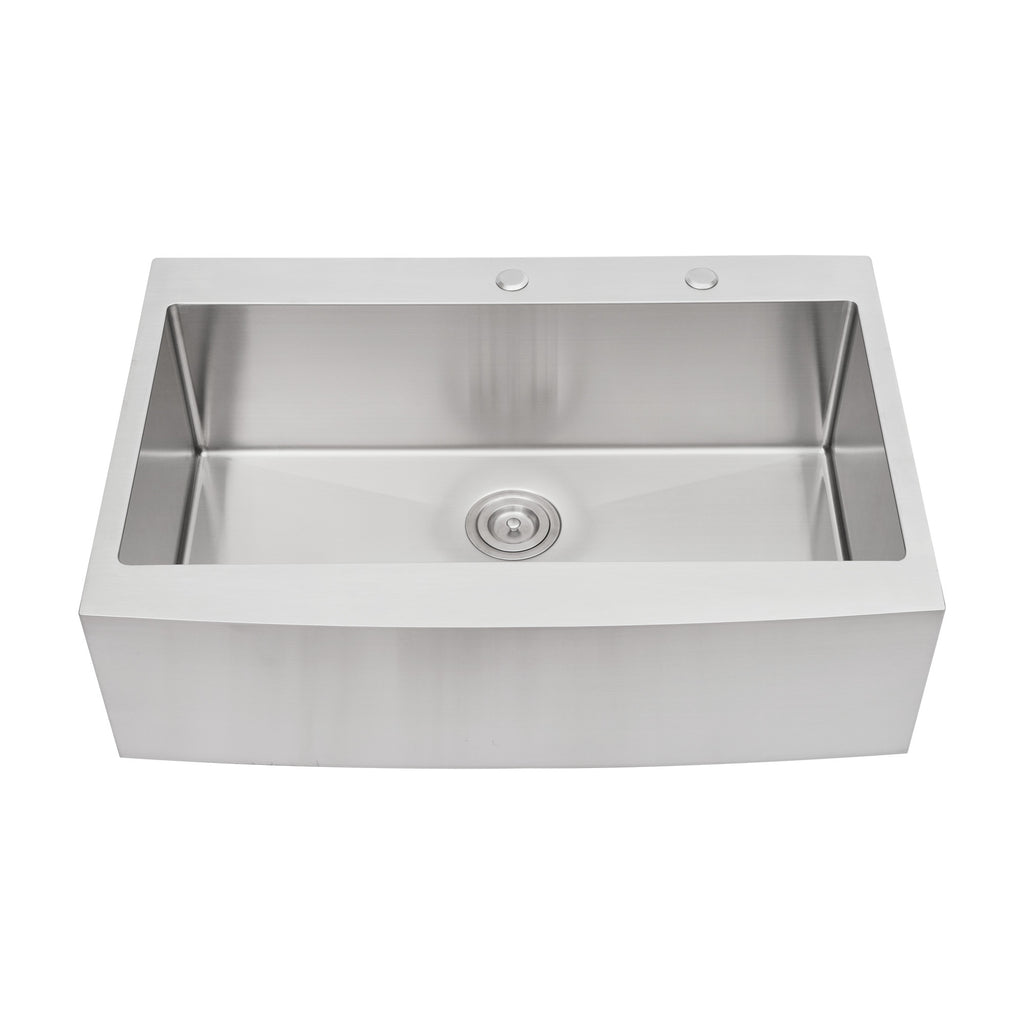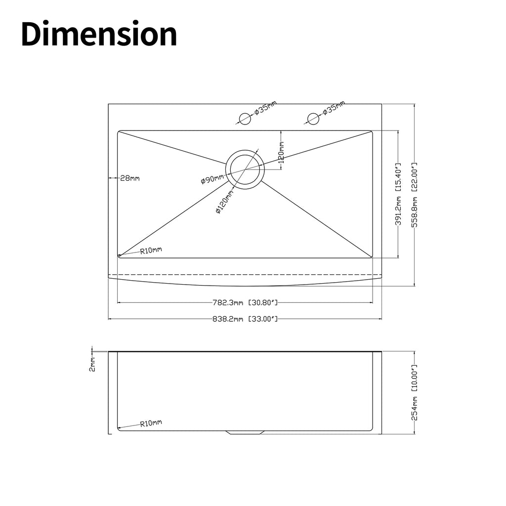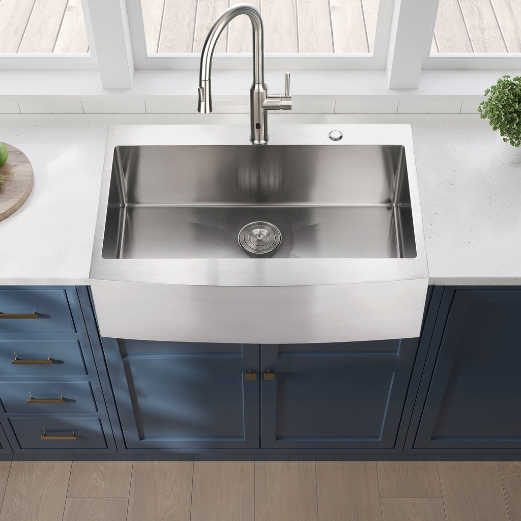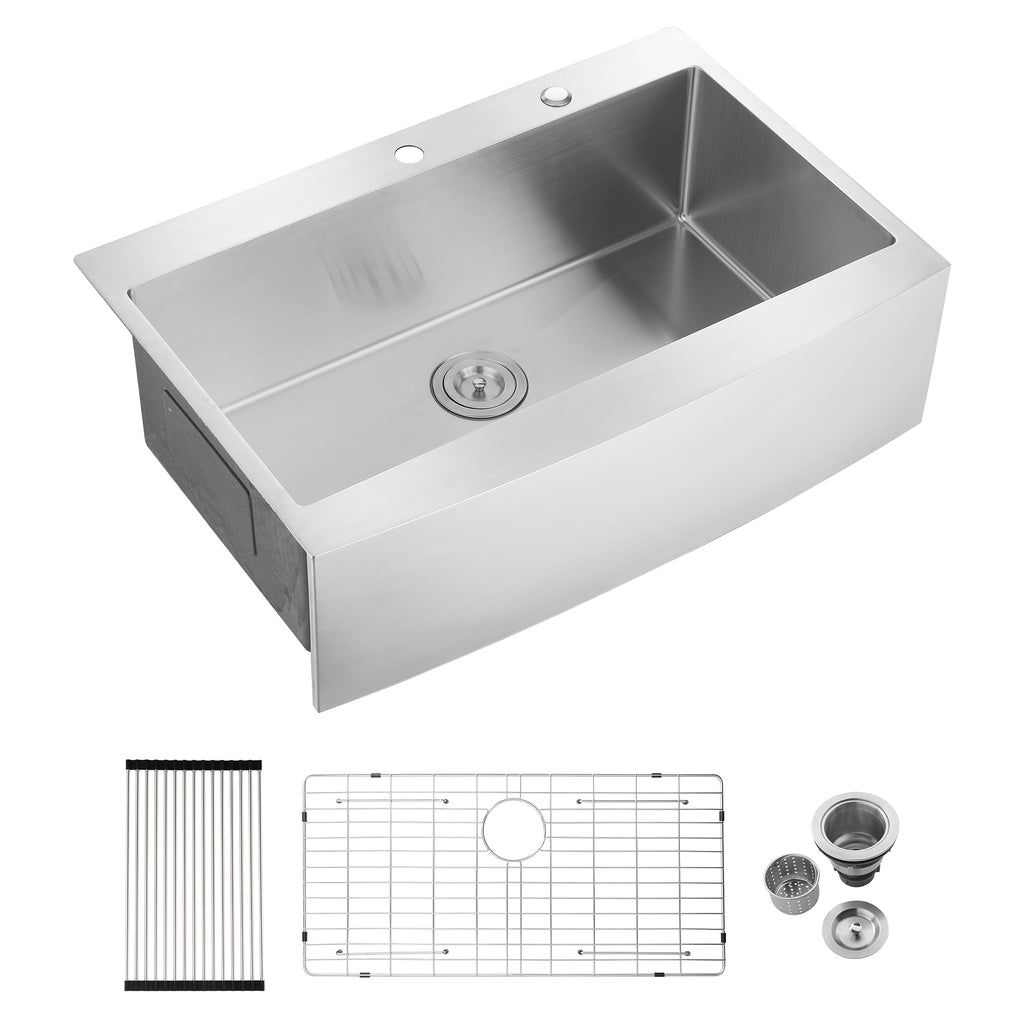 - Farmhouse Apron Single Bowl Stainless Steel Kitchen Sink with dent-resistant T304 stainless steel for superior strength and durability. Surfaces are rust and stain-resistant, easy to clean, and long-lasting.Dimension: Overall size: 33'x22'x10', Interior bowl: 30.8'x15.4', Detph: 9'