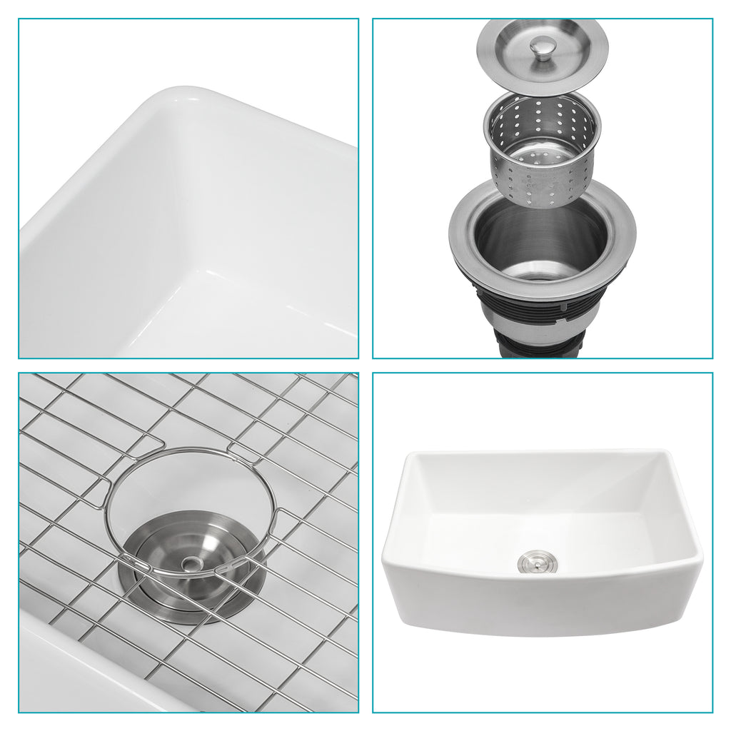 - What's in the Package --Include a 33 inch farmhouse kitchen sink, 304 stainless steel dish grid, basket strainer.