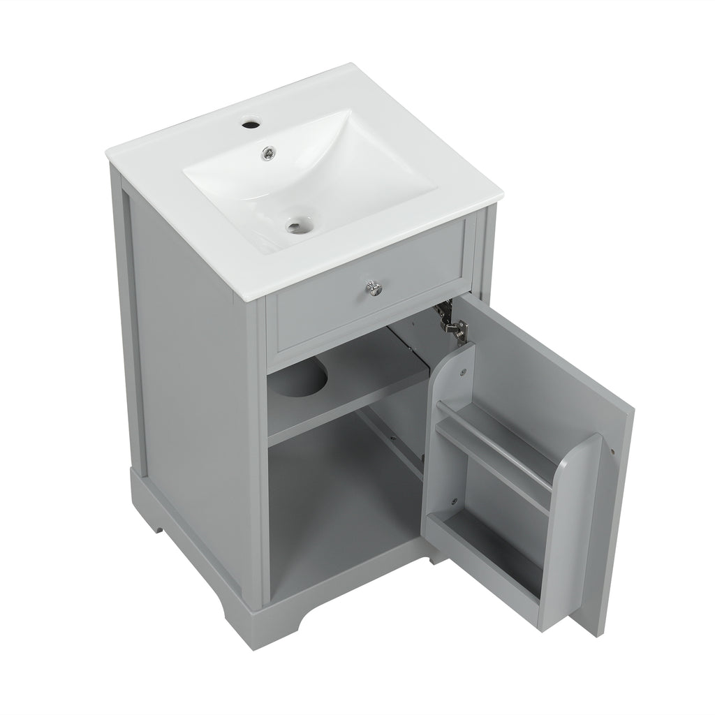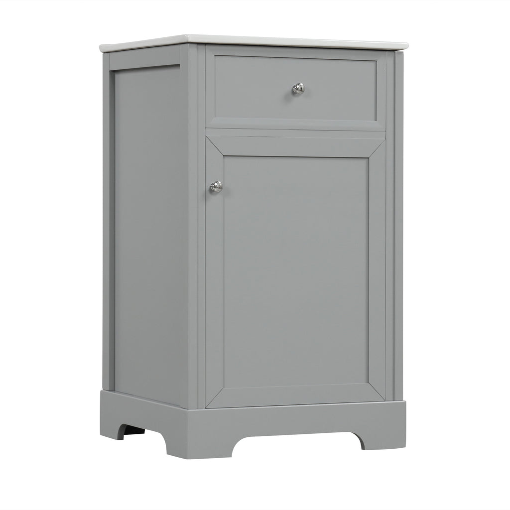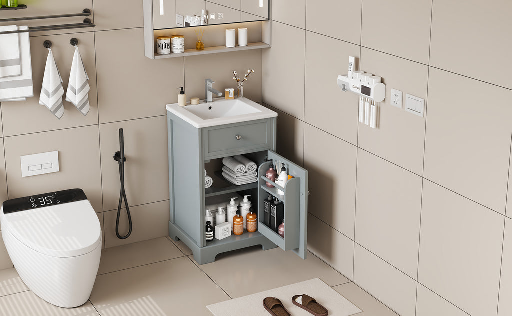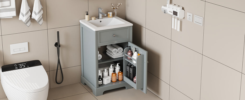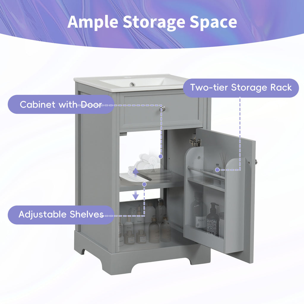 - Vanity with Cabinet & Storage Rack & Shelf - This bathroom vanity has ample storage space: one cabinet with door, two-tier storage rack on the door, and adjustable shelve. You can put soaps, towels, shampoos, tissue paper and other bathroom essentials in it so to keep them away from dust.