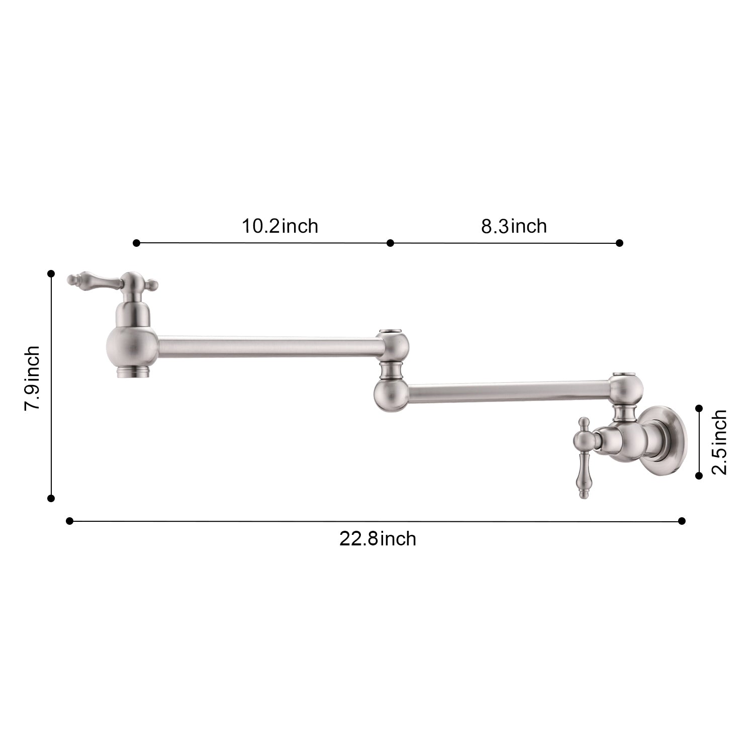 The wall-mounted pot filler faucet is not only beautiful but also practical. It has 360° rotation and folding functions, which can meet your cooking needs whether it is filling water or cleaning pots, and is foldable when not in use, saving kitchen space. The dual handles are simple to operate and provide easy on/off control to prevent dripping. The surface is specially treated to resist corrosion and not easily oxidized. Make your kitchen look cleaner and tidier.