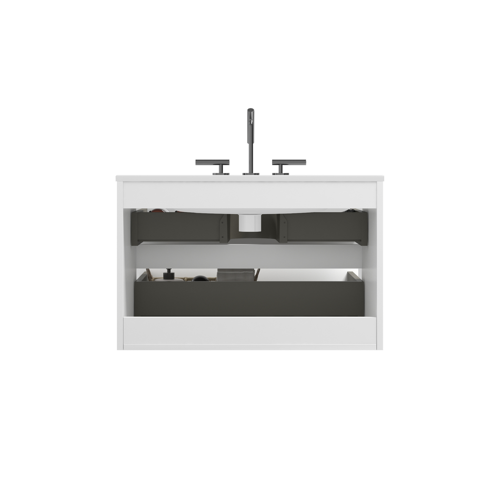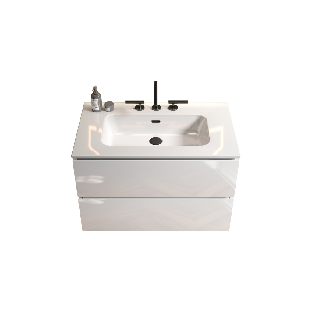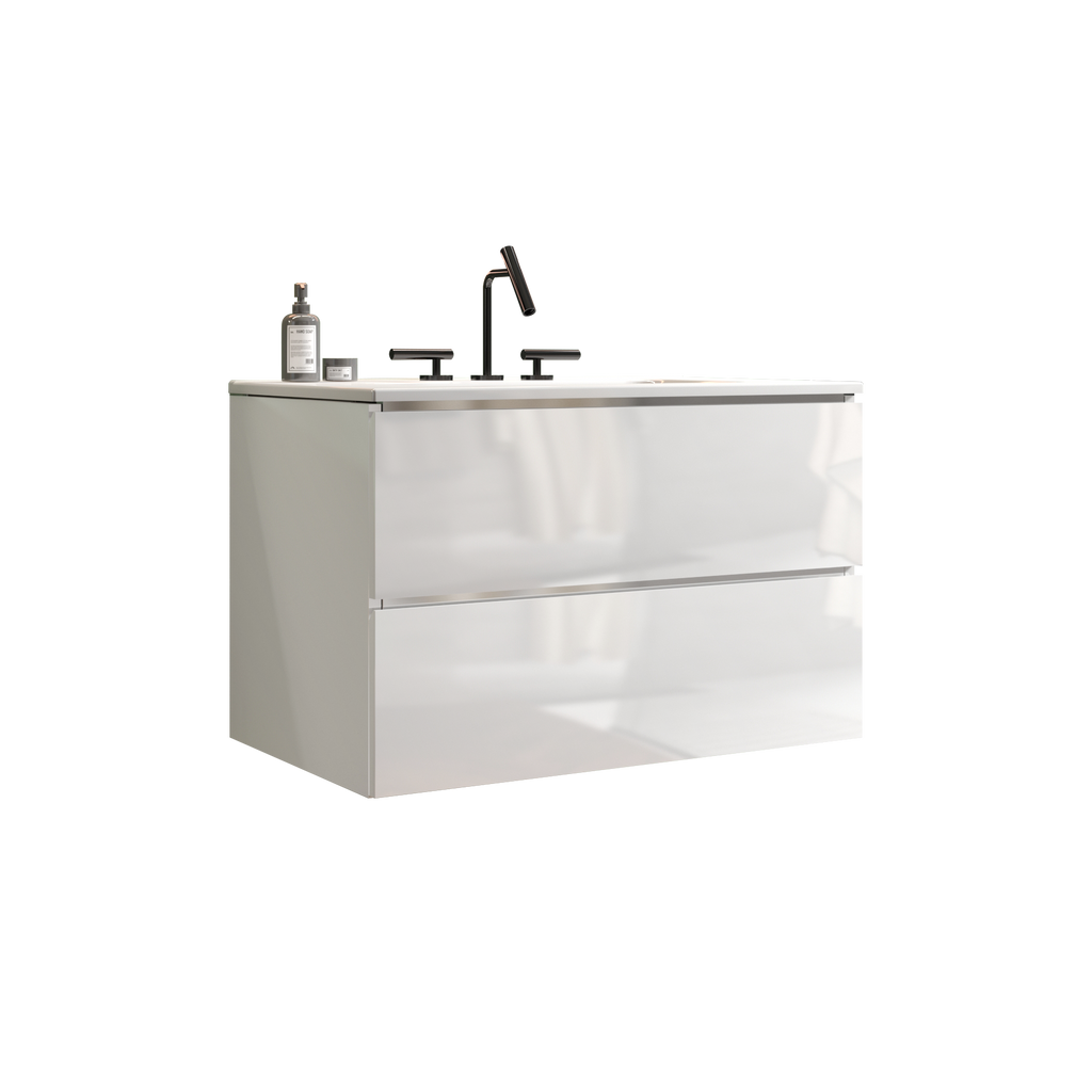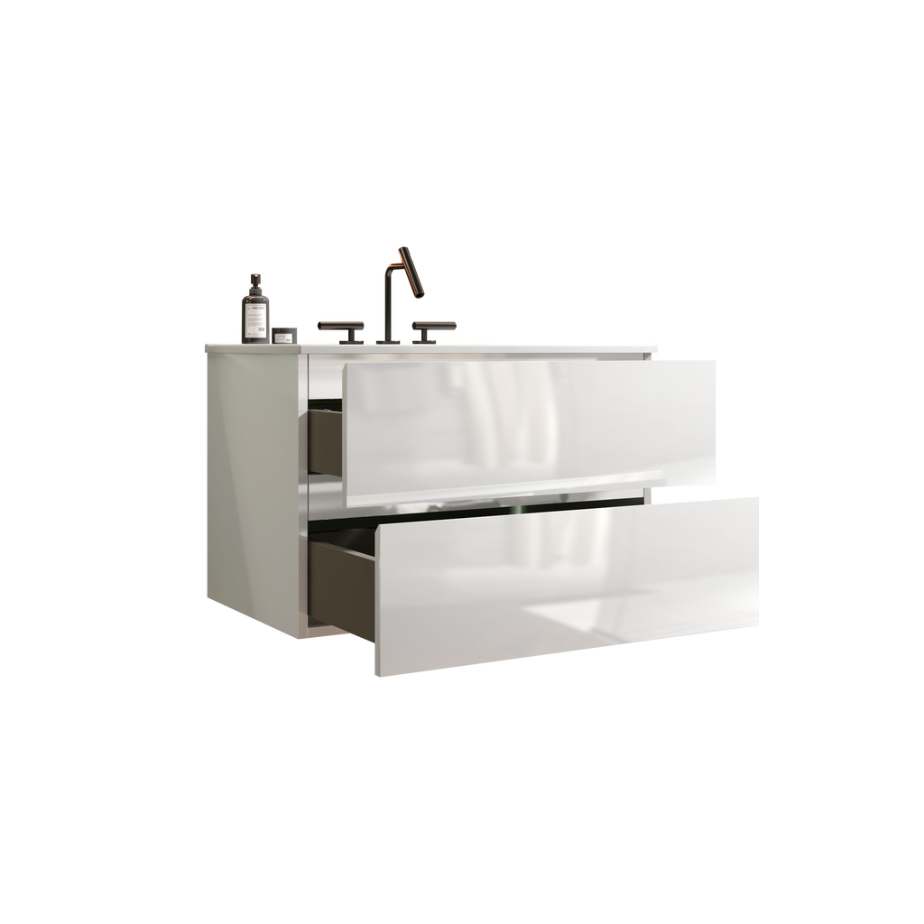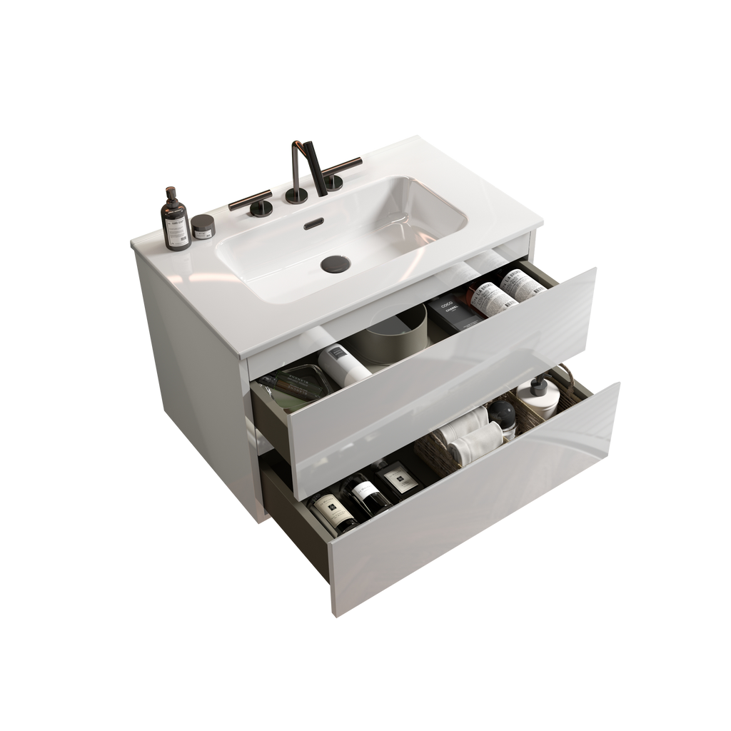 The double drawers maximize the use of space, offering a 20% increase in storage capacity to keep your bathroom essentials organized and within reach. And thanks to the DTC soft-closing silent drawer runners, you can enjoy a serene environment, free from disruptive noises. Featuring an integrated 45° sloping handle-free design, it embraces a minimalist approach to design. The glossy white cabinet enhances the visual appeal and creates a seamless look, adding a touch of modern refinement to your bathroom.