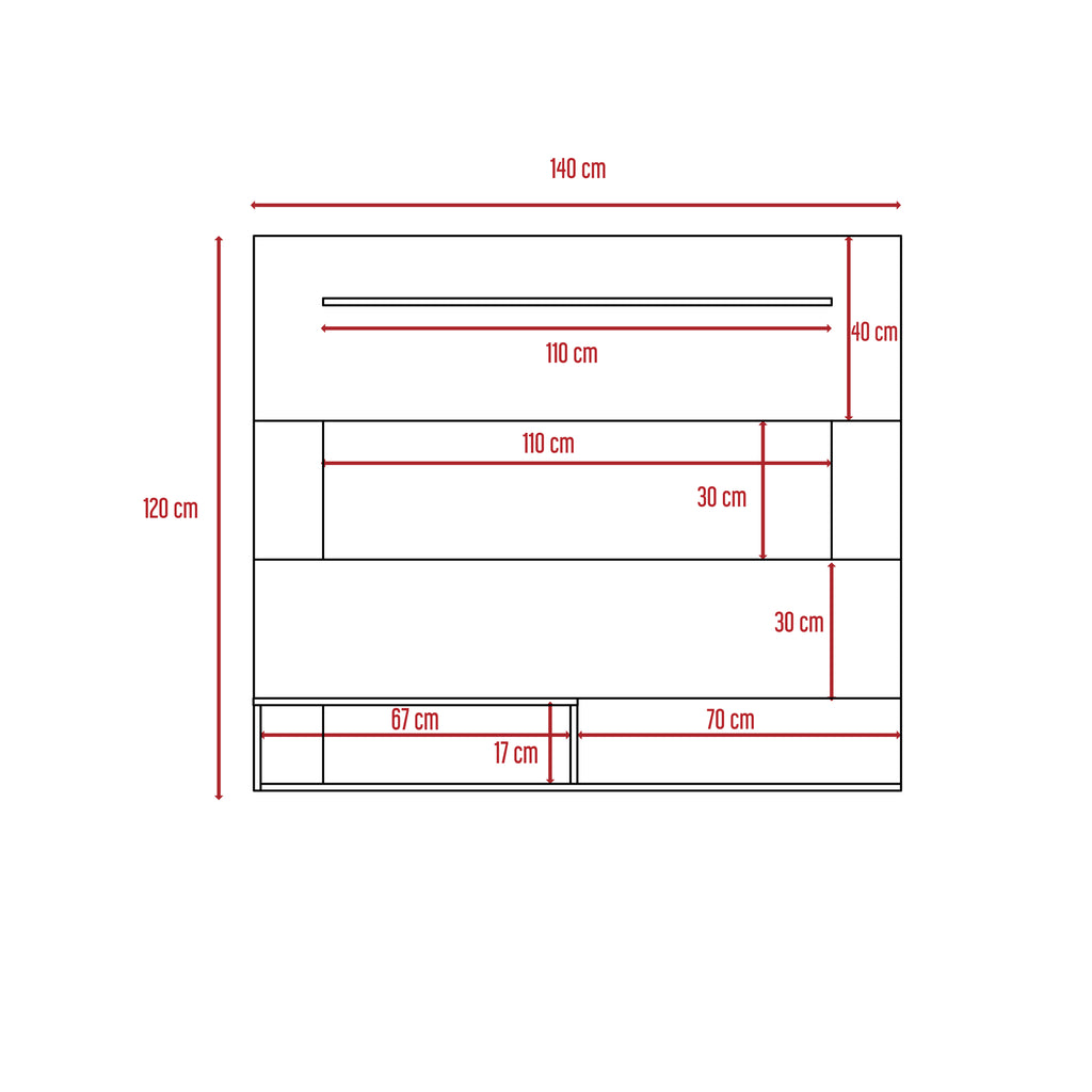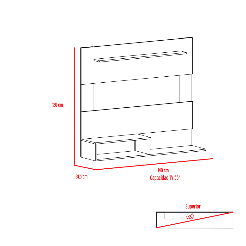 - Superior shelf dimensions: 4.7' D x 43.3' W, with a TV space of 11.8' H x 43.3' W