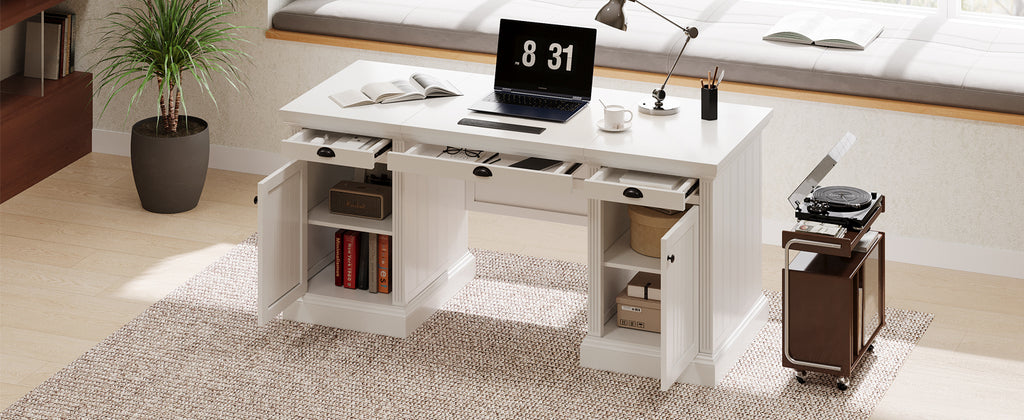 - This home office desk with storage offers ample storage solutions, including 2 cabinet and three drawers.The drawers provide enough space for notebooks, pens and stationery, and the cabinet has extra deep space to store items such as files, books, magazines and other office necessities.