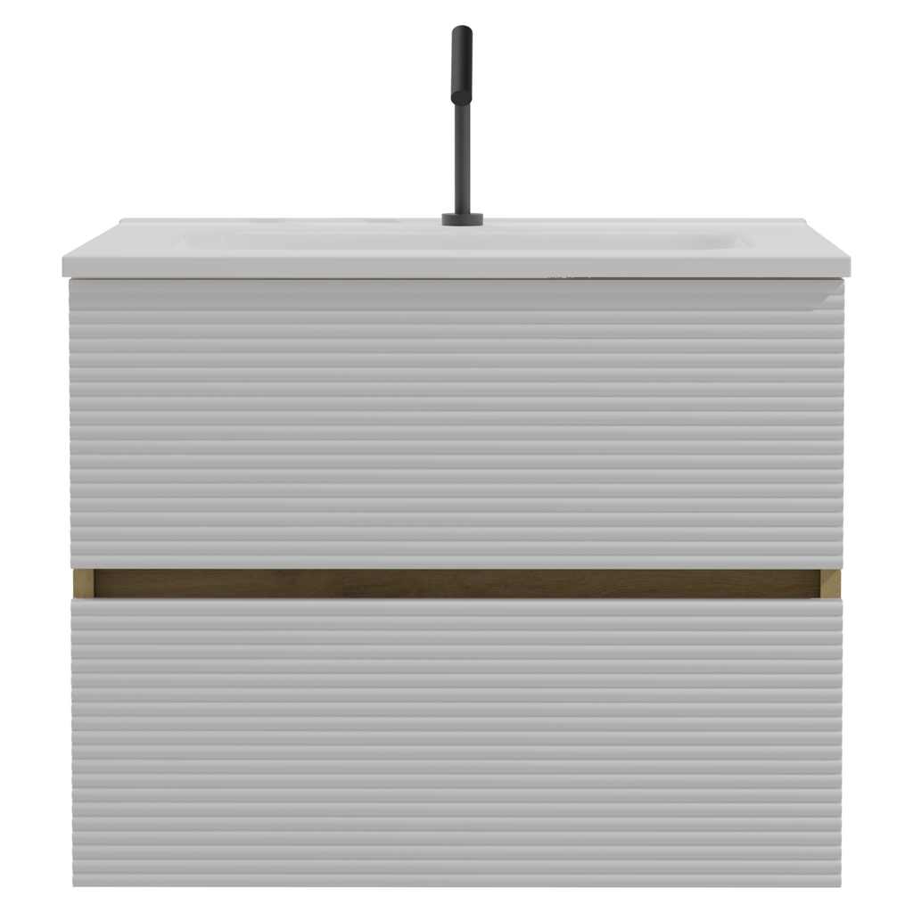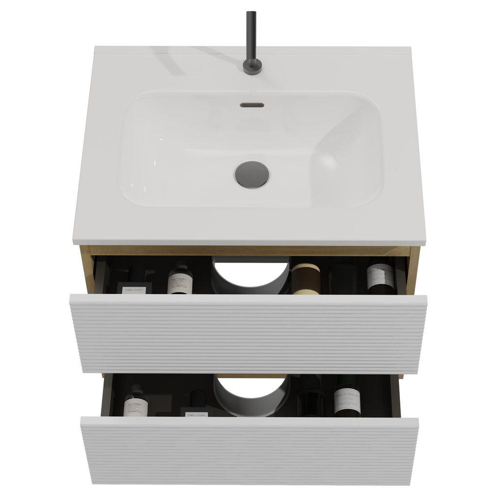 The double drawers maximize the use of space, offering a 20% increase in storage capacity to keep your bathroom essentials organized and within reach. And thanks to the DTC soft-closing silent drawer runners, you can enjoy a serene environment, free from disruptive noises. Featuring an integrated 45° sloping handle-free design, it embraces a minimalist approach to design. The sleek Natural Oak cabinet enhances the visual appeal and creates a seamless look, adding a touch of modern refinement to your bathroom.
