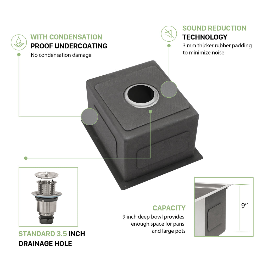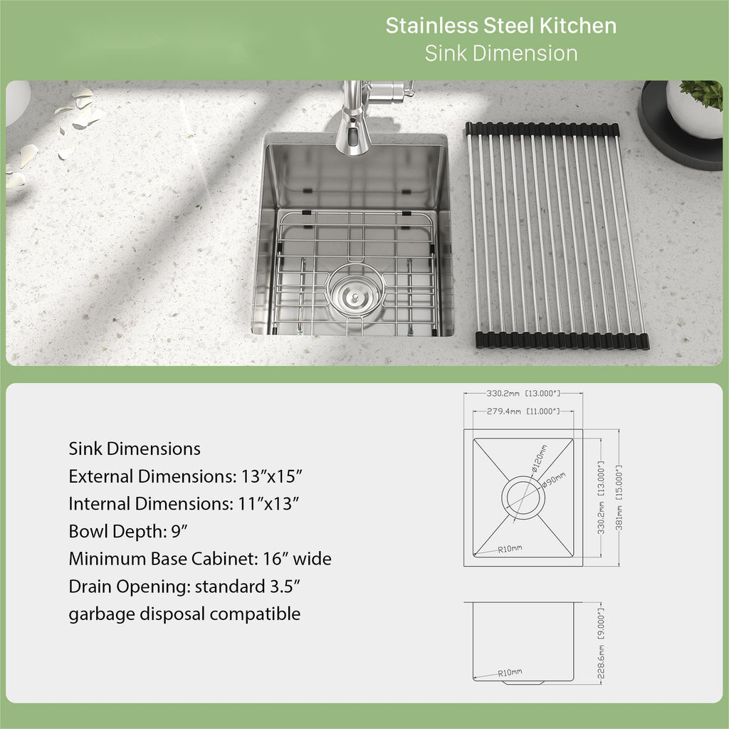 - Upgrade 13 x 15 inch Stainless sink with 9 inch extra deep single bowl, allows you to soak and clean dishes and glasses. Undermount installation provide you with more counter space, create a clean, seamless and modern appearance between the sink and countertop, as well as easy to clean curved corners.