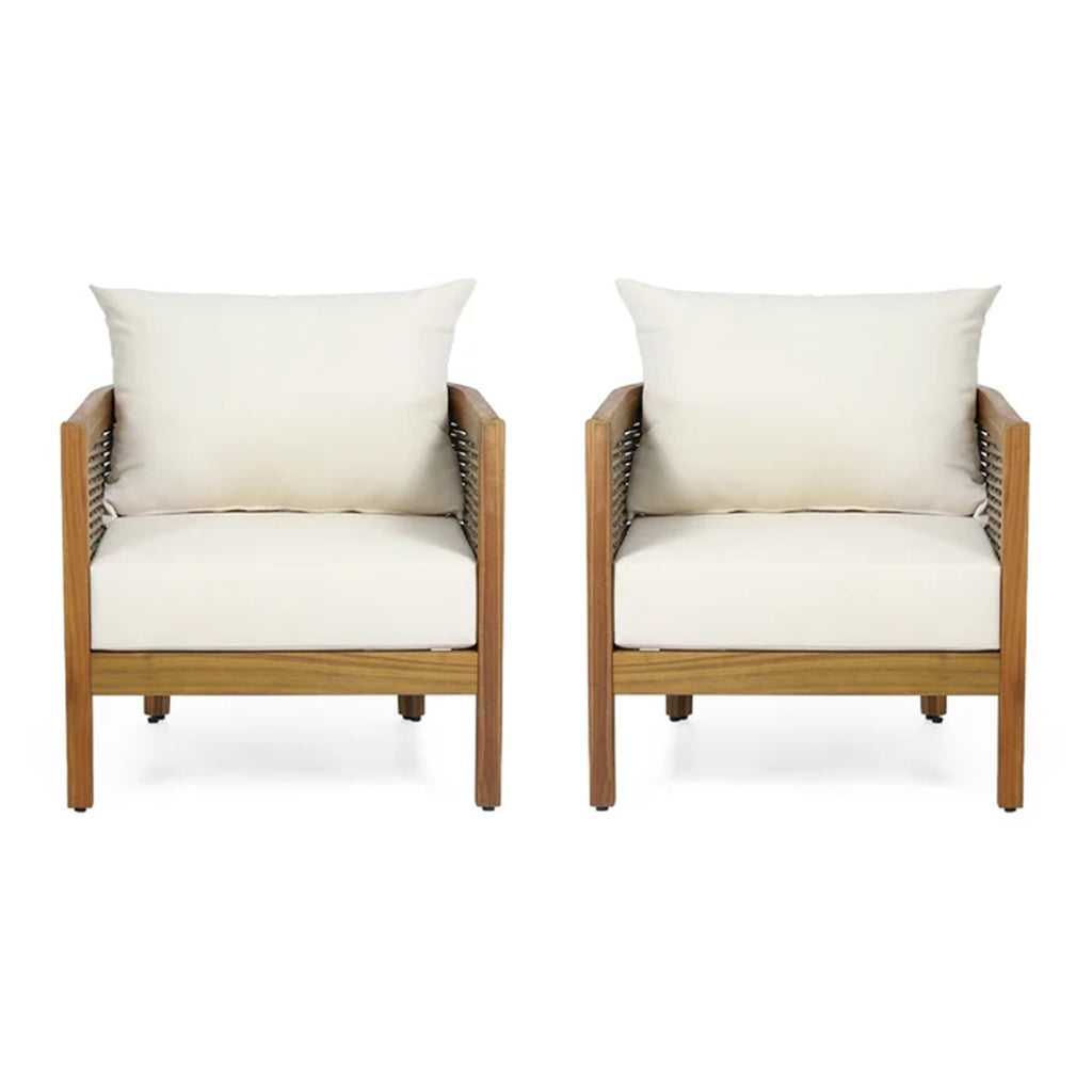 Enjoy the warm sunshine in luxurious seating that is sure to bring an extra boost of style to your space. Combining a gorgeous blend of mixed materials, our club chair set will be a flawless addition to any outdoor lounge area. This can be used as a standalone or can be used to accent your existing furniture, making this a dream for those who love to personalize their space. With solid acacia wood frames, wicker accents, and plush outdoor cushions, these chairs offer hours of conversation for you and your guests.