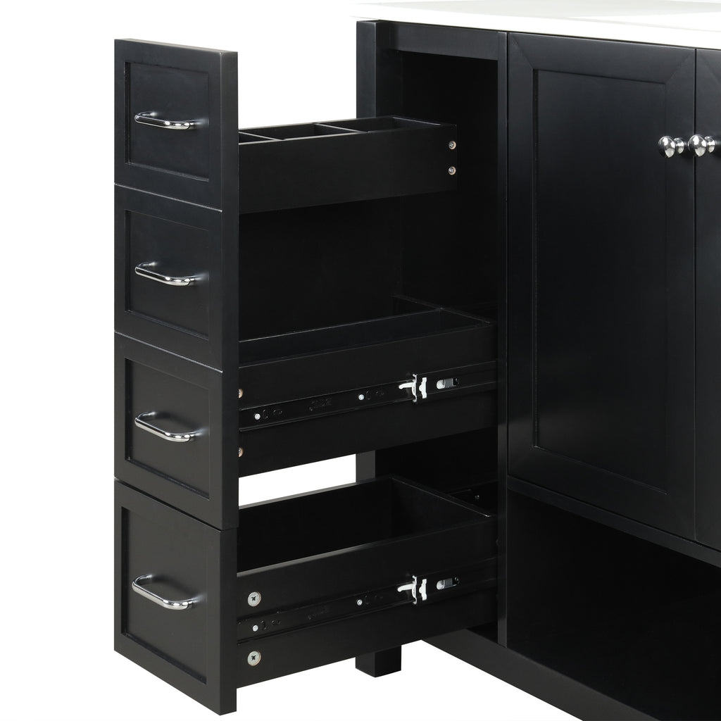 - Premium Ceramic Sink: Crafted from durable, solid ceramic, this elegant white sink features an overflow design and three faucet holes for added convenience. Its smooth, glossy surface is easy to maintain, allowing you to keep it shining effortlessly. Compatible with an 8' faucet (sold separately), the sink is positioned on the right side of the cabinet. The spacious lift area above offers ample storage for daily essentials like towels and cups, helping you keep your bathroom organized and clutte