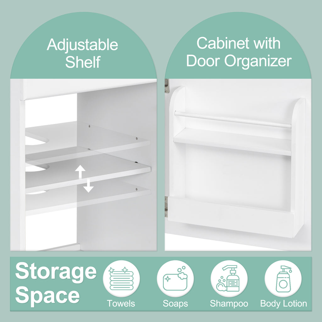 - Storage Space: There is a door shelf from right orientation and an adjustable shelf in the cabinet. You can place small toiletries on the two-tier door shelf and different sizes of items into the cabinet to keep them away from dust.