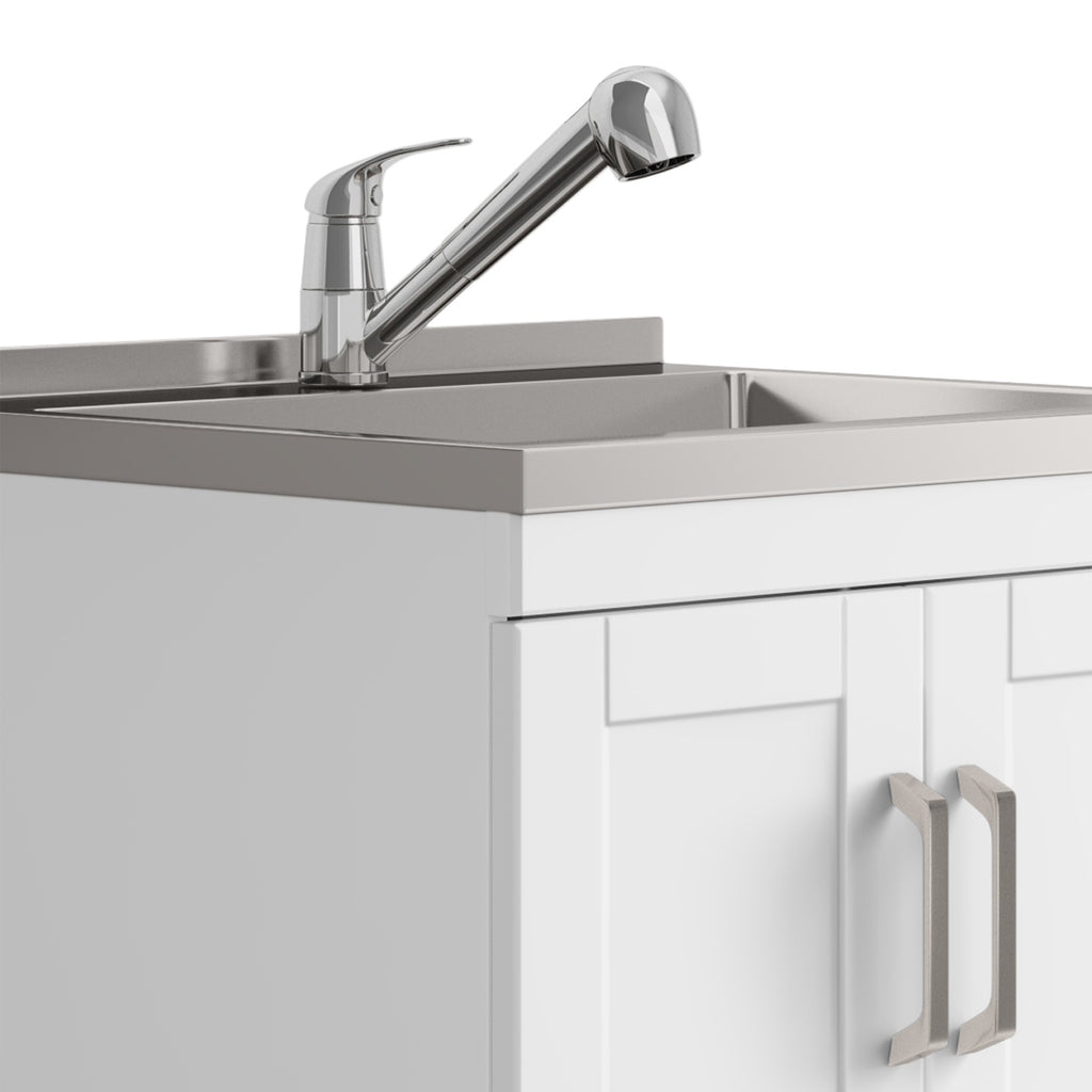 - Features two (2) doors with brushed nickel hardware open to plenty of storage, Extra deep 20 gauge welded stainless steel sink