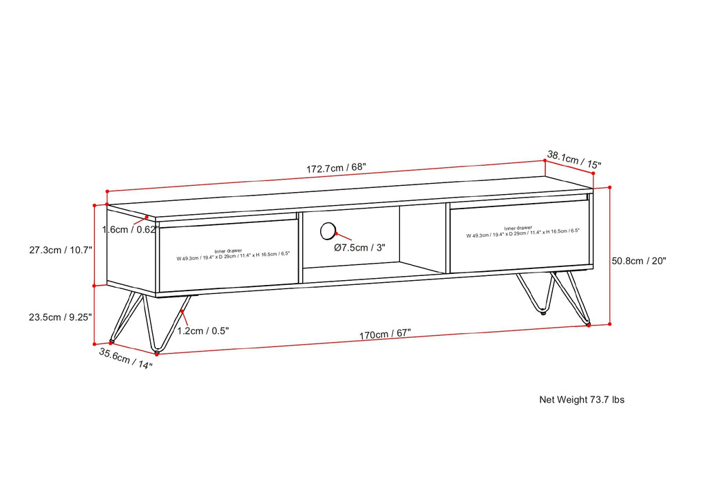 - Features two (2) side drawers with soft closing hinges and one (1) open central storage compartment for plenty of storage
