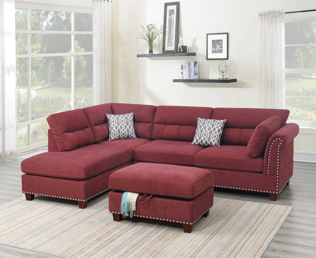 Enjoy a star studded affair with this 3-piece sectional sofa set covered in velvety smooth fabric. Trimmed in a nickel-finish studding, the tightly upholstered unit includes a reversible chaise, cocktail storage ottoman and two accent pillows. Available in slate, tan and paprika red.