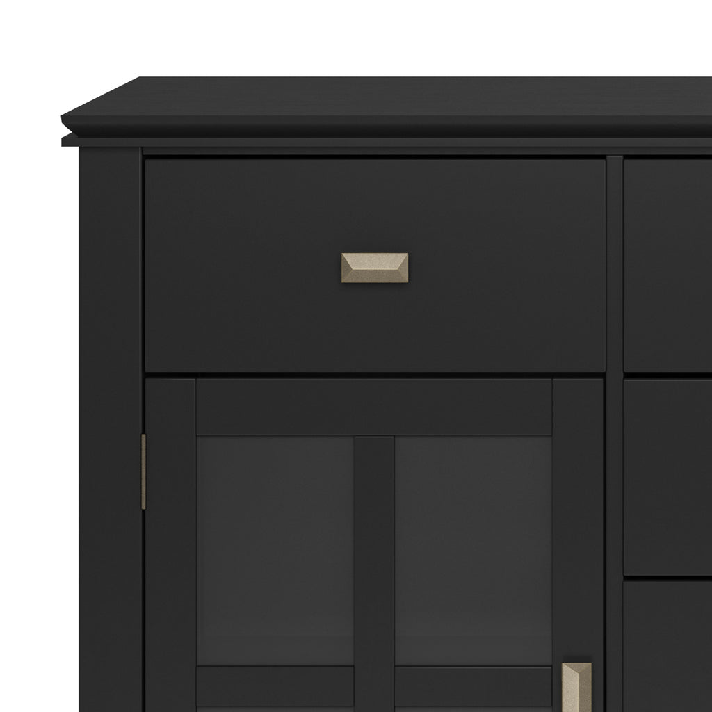 - Features six (6) central drawers with metal glides, and two (2) side doors with tempered glass that open to large storage spaces with one (1) shelf each.