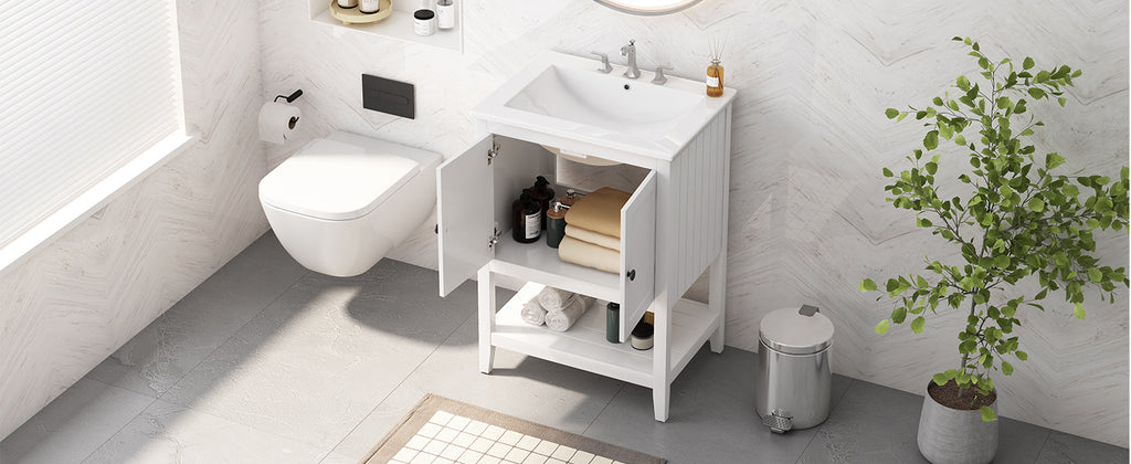 With modern and simple-lined style, this practical bathroom vanity is a great furniture for your bathroom with limited space. Considering the space and aesthetics, this bathroom vanity is promoted to market in two Morandi colors, white and white. These two low saturation colors have an aura of high class and bring a tranquil atmosphere to your bathroom. And the Morandi colors expand the space visually as well. Water-resistant materials of this product ensure the duration and comfort of usage, The spacious cabinet and open bottom shelf are the perfect place for put your towels and bathroom essentials. You can keep the half-moon shaped sink shinning effortlessly since the ceramic is smooth and easy to clean. This bathroom vanity is a best choice for your bathroom, it offers multiple function and beautiful shape at the same time. It’s beyond your expectation.