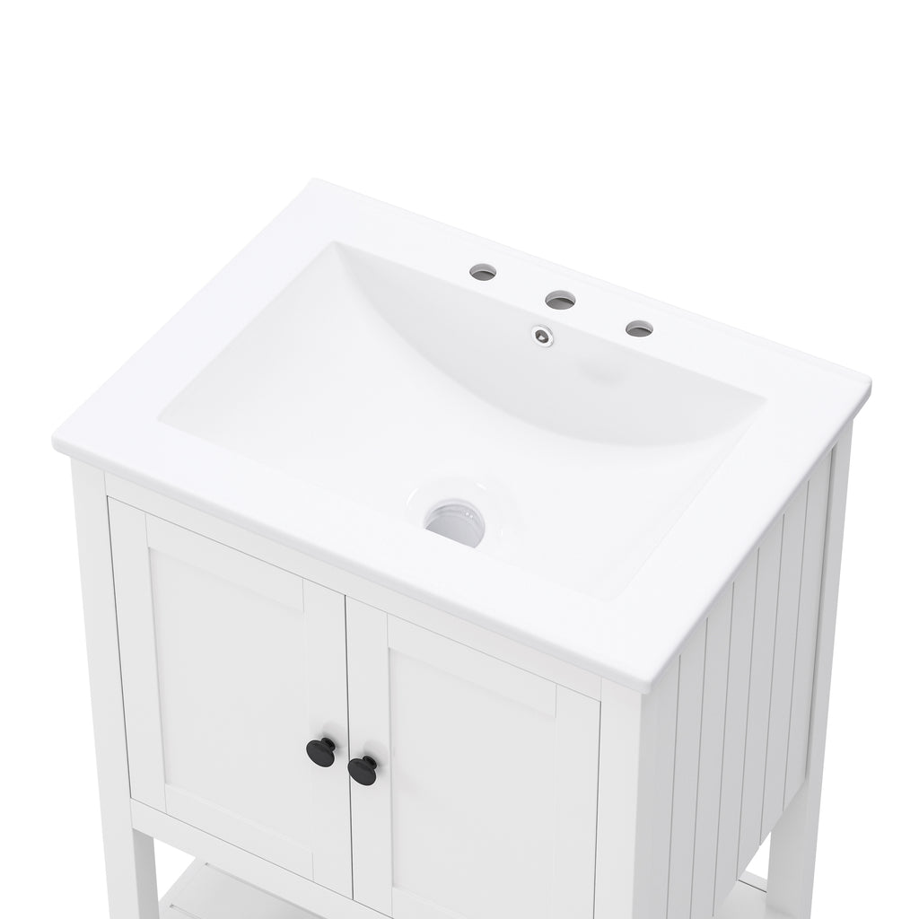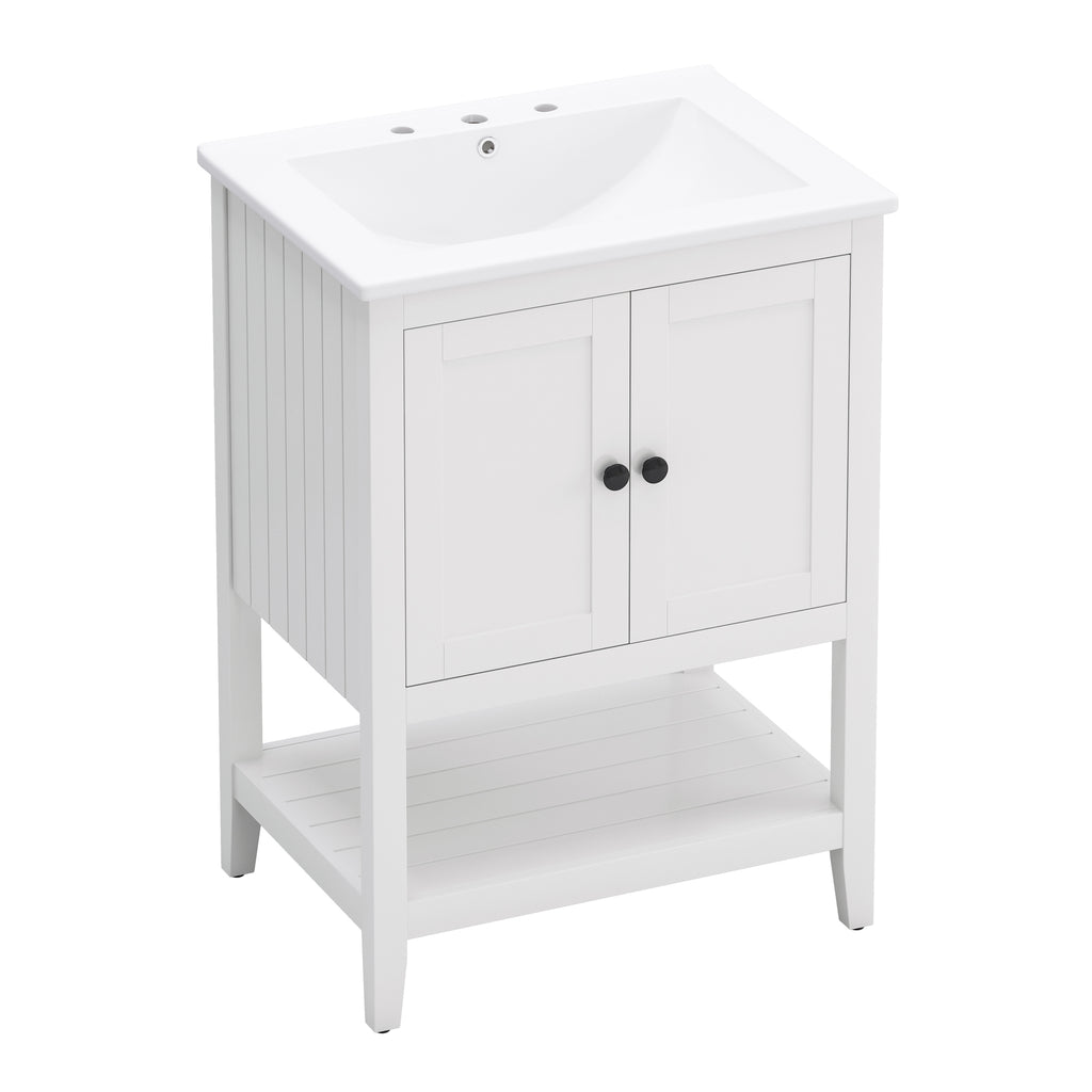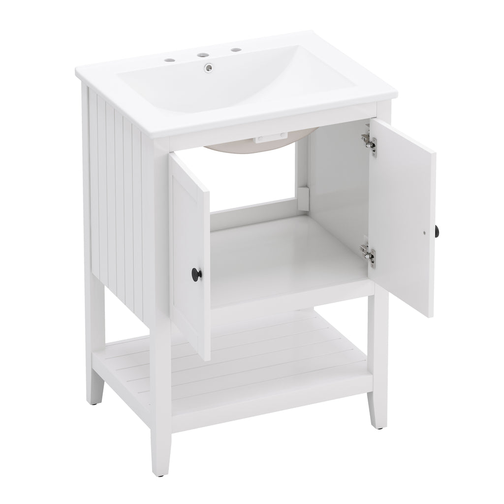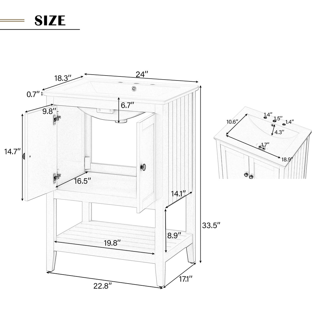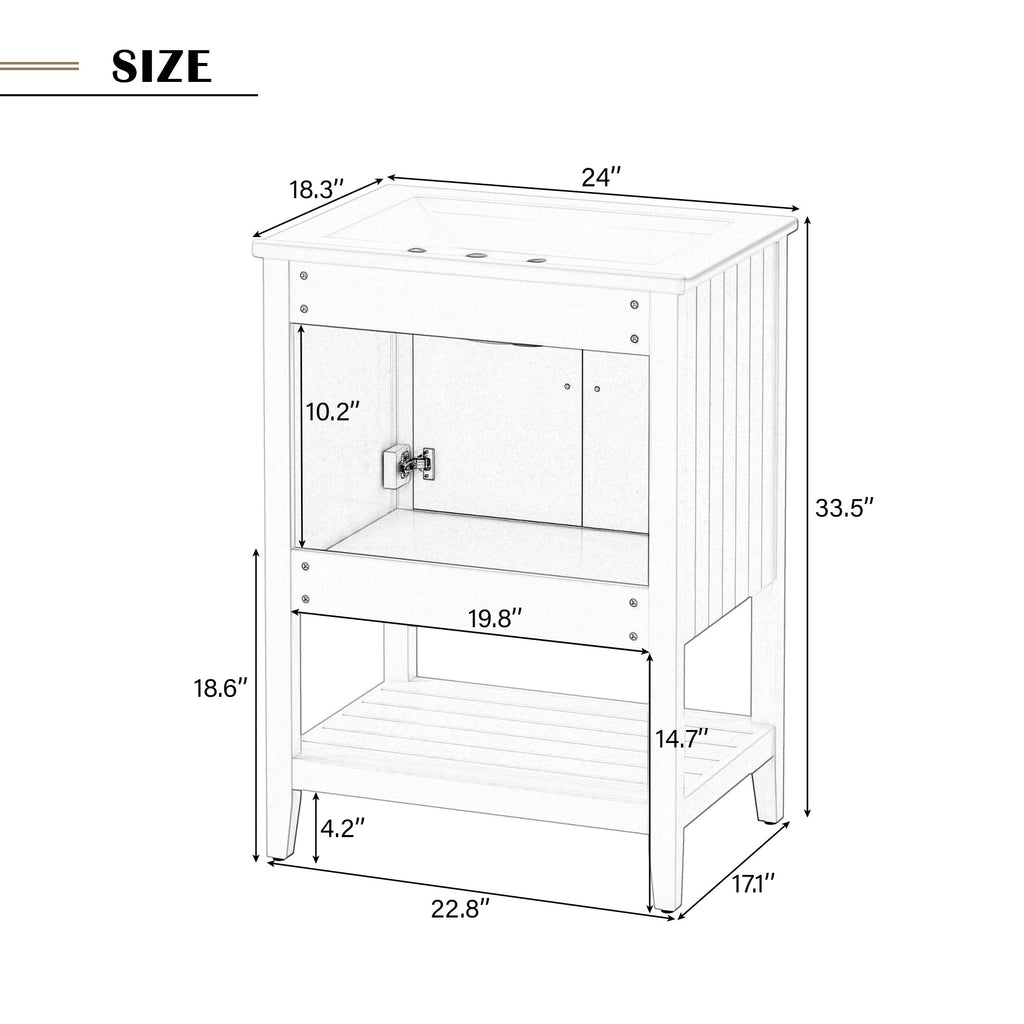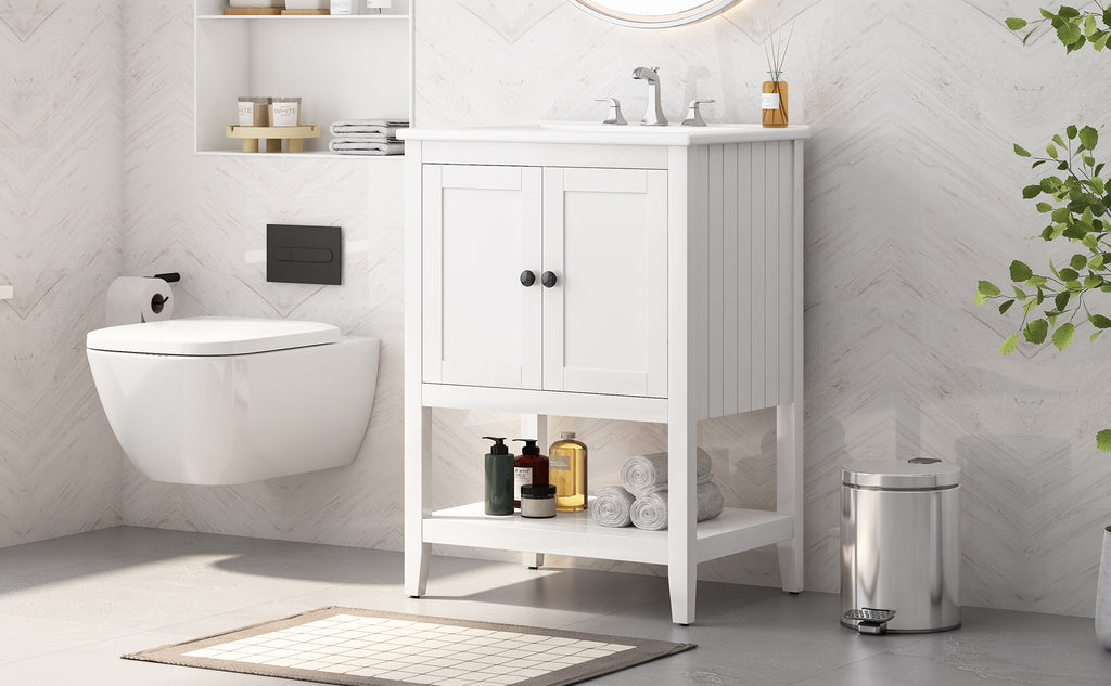 - Ample Storage Space: This simple and practical design freestanding bathroom vanity features a cabinet and an open style shelf for storing bathroom essentials. Both the cabinet and the open bottom shelf are spacious, and both offer enough space to most necessities used in bathroom. With a hollow-out design MDF board, the open bottom shelf is a perfect place to accommodate bath stuff such as shampoos or towels.