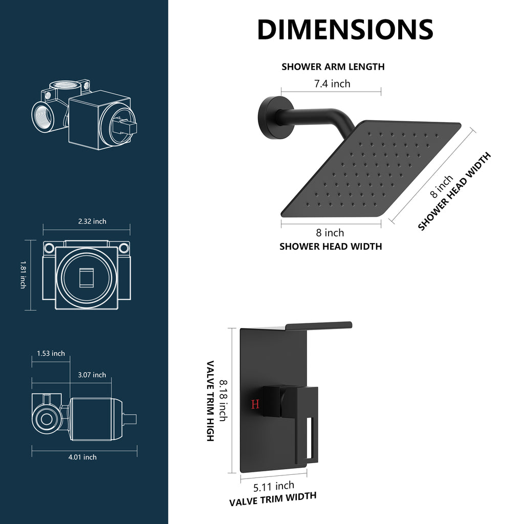 Included Components Cold and hot control handle, 8 inch square shower nozzle, shower bracket, 15 inch shower arm
