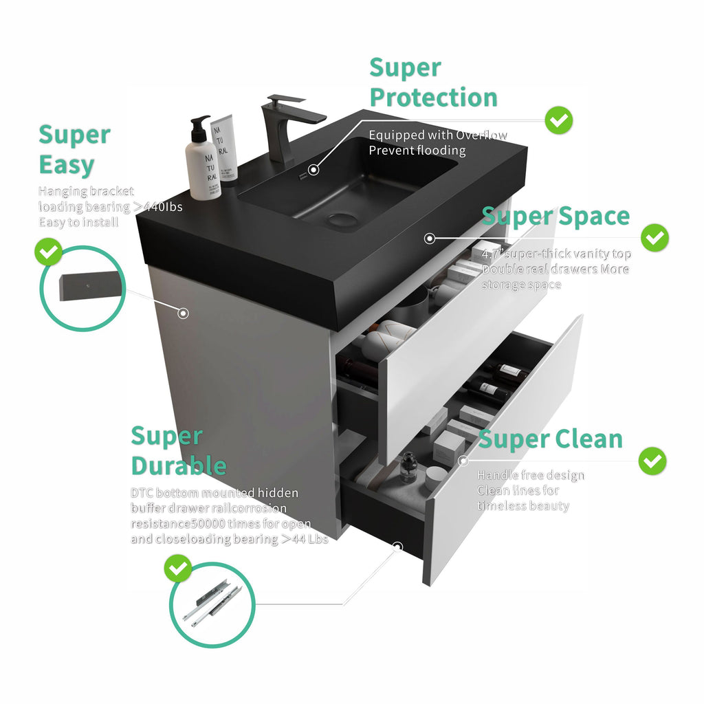Introducing Alice, the epitome of modern elegance for your bathroom sanctuary. The Alice bathroom vanity is a stunning wall-mounted masterpiece designed to transform your space into a haven of sophistication. With its sleek matte black engineered stone basin and flawless white finish, Alice effortlessly exudes contemporary charm.