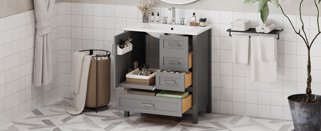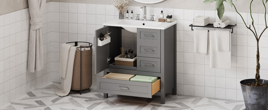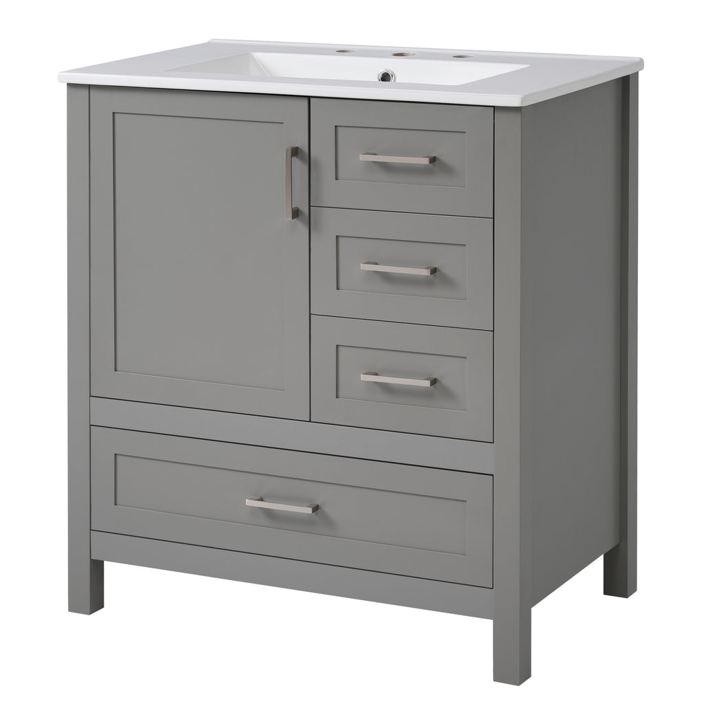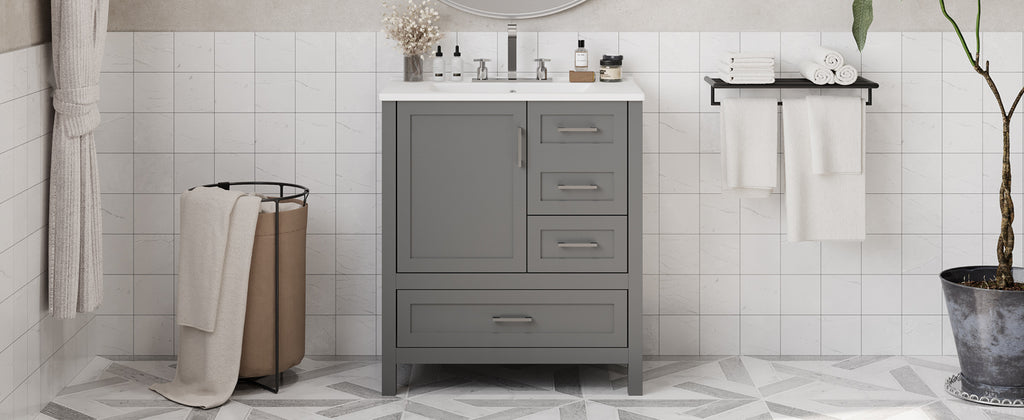 Transform your bathroom into a sanctuary with our 30-inch gray vanity. The sleek silver handles draw your attention to the soft, muted elegance of the design. Beneath the smooth, white ceramic basin, easy to clean and ever-pristine, lies ample storage—an organized haven for all your essentials.