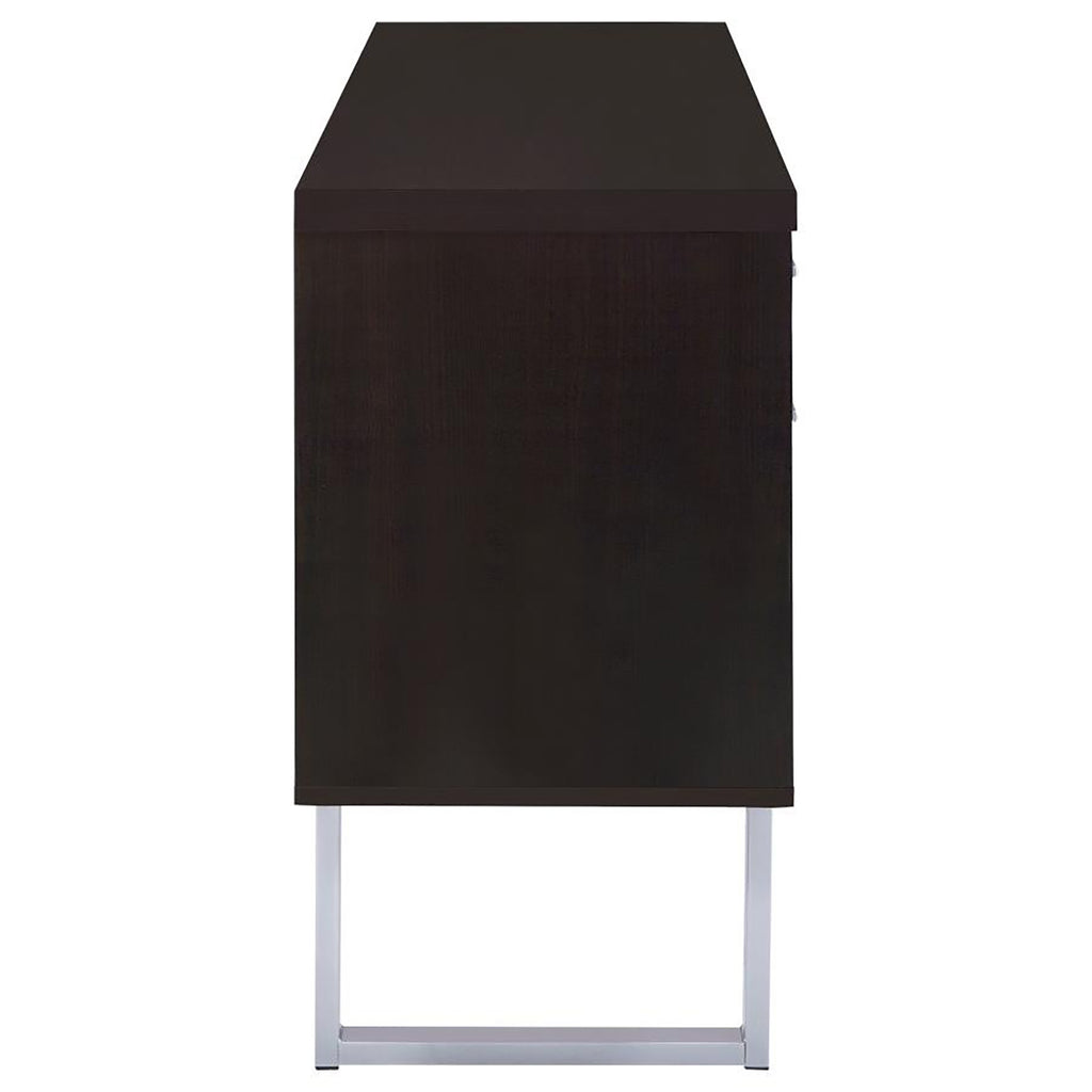Five ample drawers and an open compartment with two shelves make this credenza a welcome functional storage piece. The elongated and streamlined profile, sleek cappuccino finish and modern U-shaped metal legs vault it to a design level that's perfect for your high-style contemporary living room.