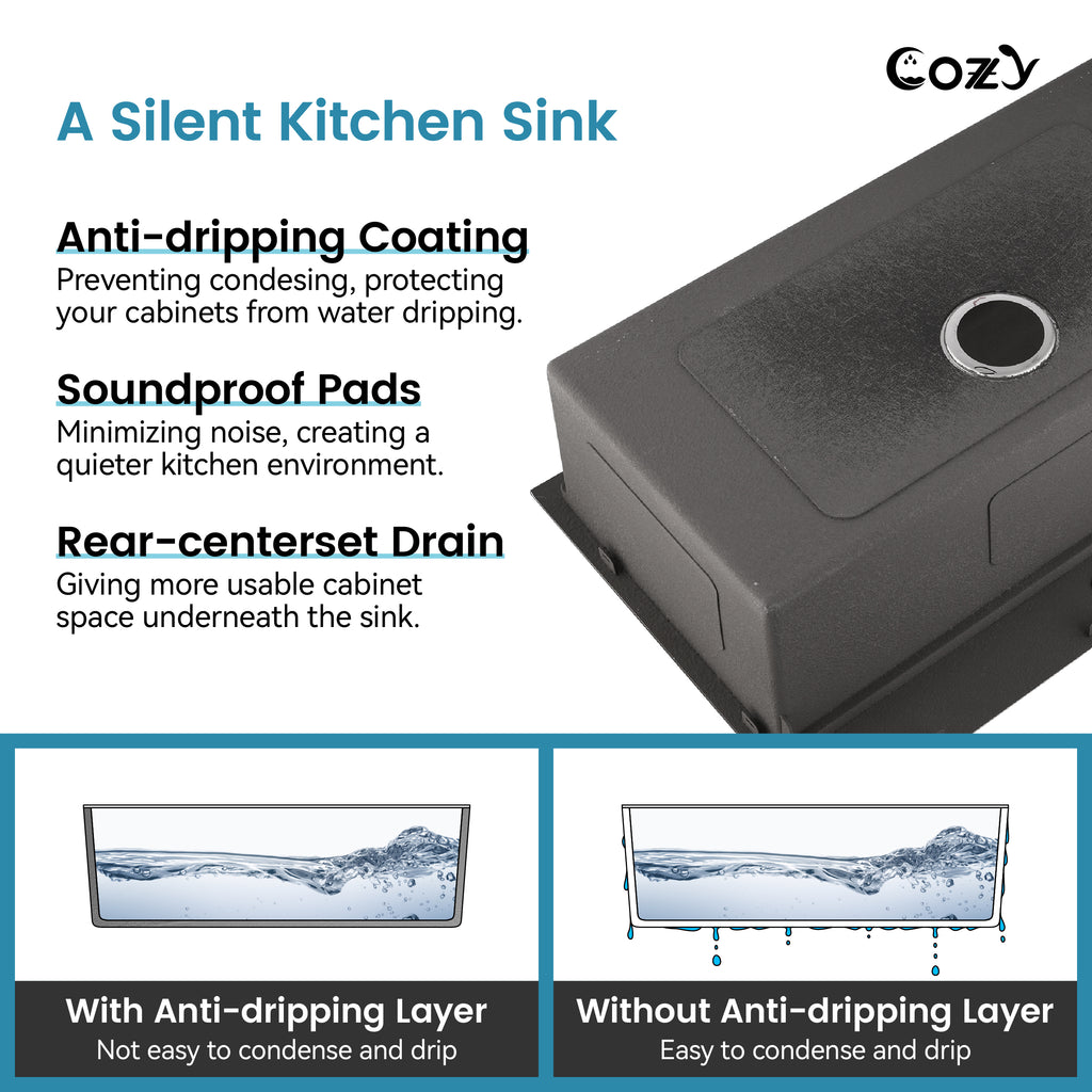 - X-SHAPED DIVERSION DESIGN: The bottom of the sink adopts a scientific X-shaped diversion design which makes it fast, and effectively drain off water. EFFECTIVE NOISE REDUCTION: The outer side of the sink's bottom is not only covered with sound-dampening pads but also sprayed with damp-proof paint coating to achieve the effect of noise reduction and moisture absorption, making the sink quieter to use and reducing condensation at the bottom of the sink.