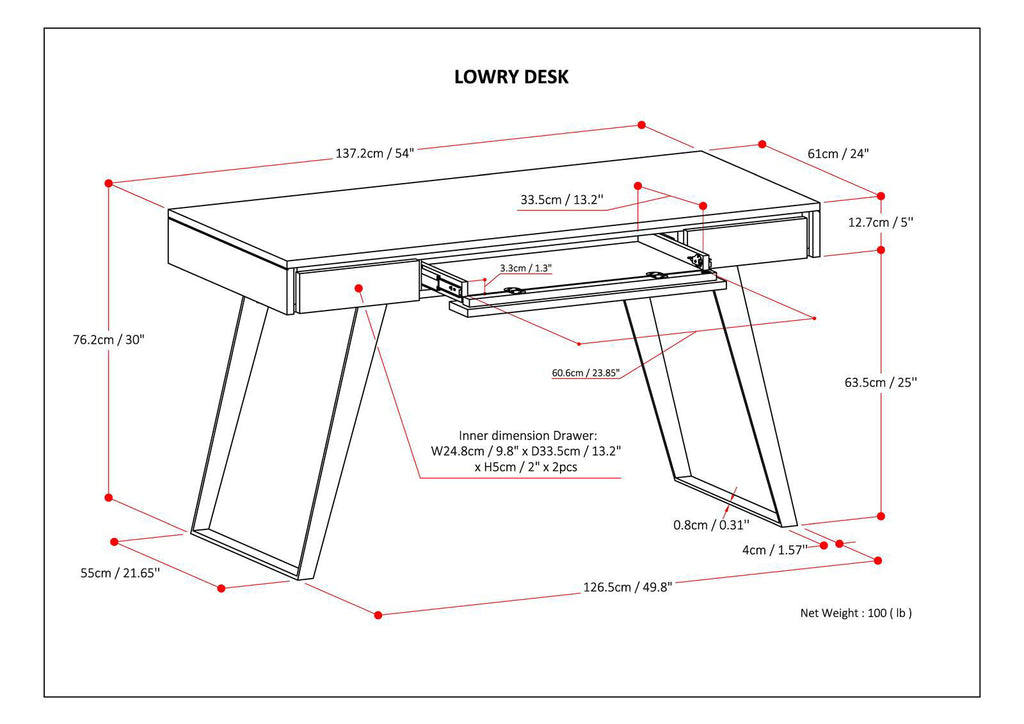 - Features a flip down pull-out keyboard tray, two (2) drawers with discreet hand pulls and metal drawer glides