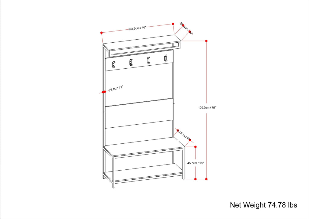 - Features sturdy black metal frame, four hooks, bench, open bottom shelf and top bar