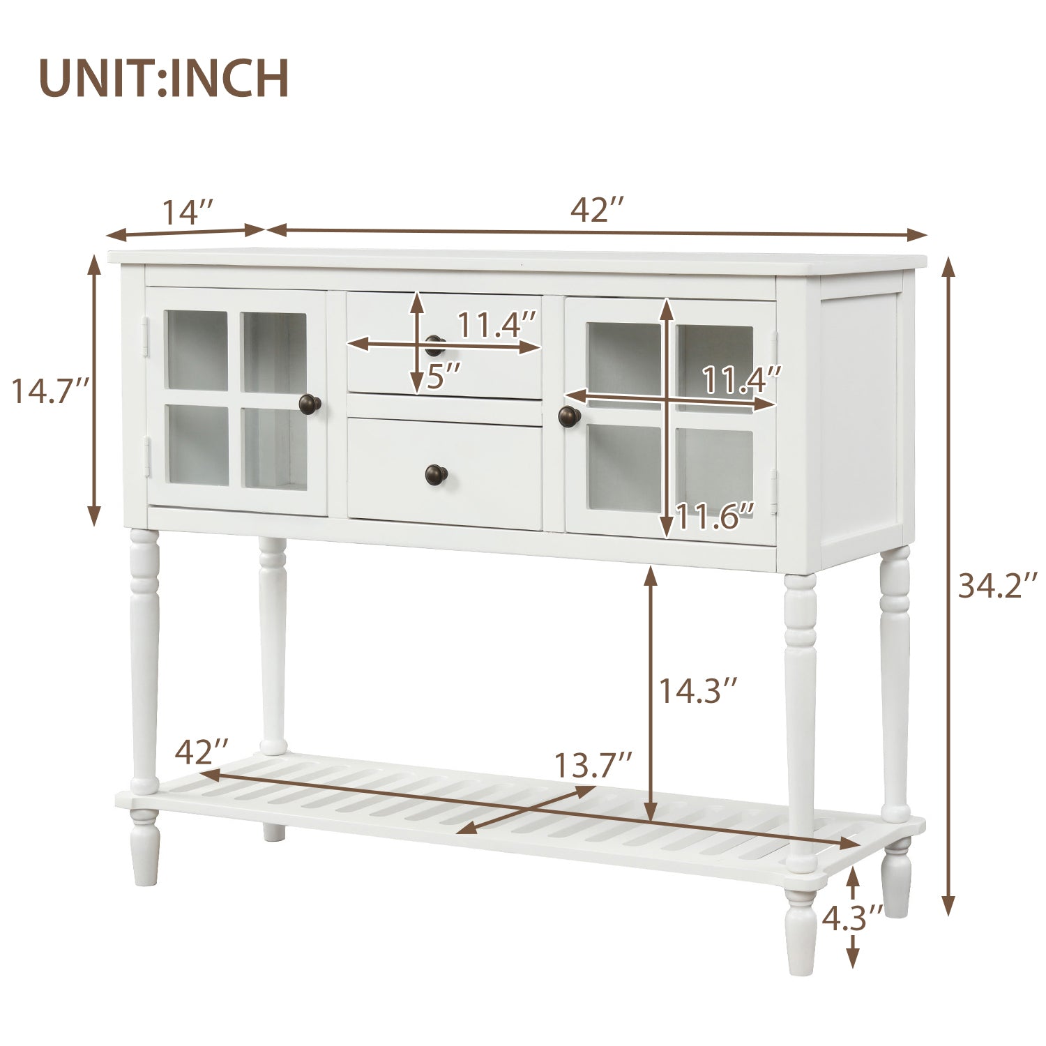 - Partial Assembly Required. Sideboard cabinet measurements: 42' L x 14' W x 34.2' H. Easy assemble, simply attach the four base legs and bottom shelf.