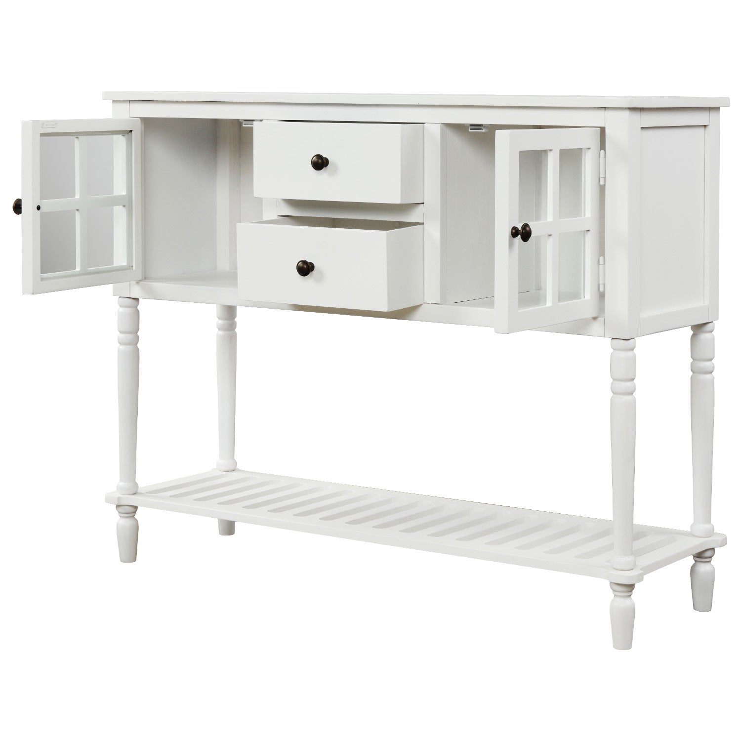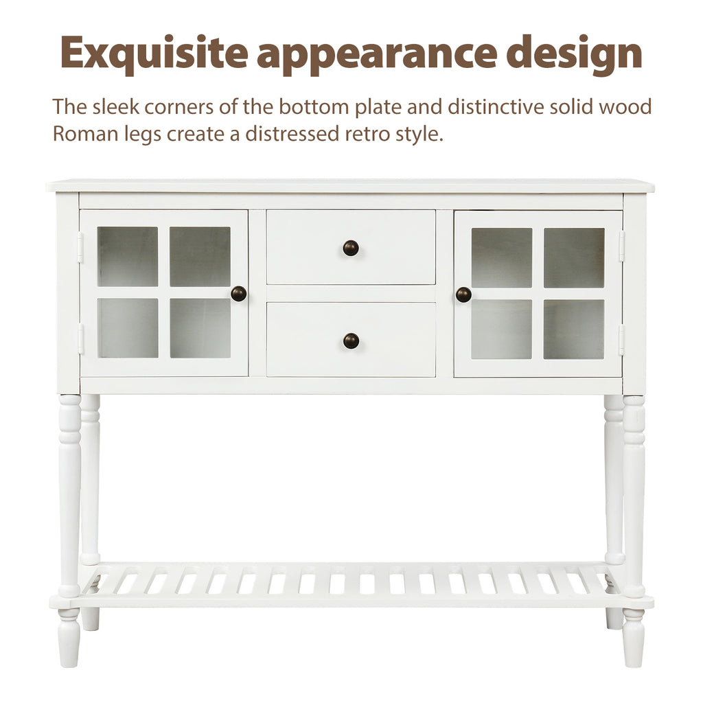 Featuring spacious open table top and bottom shelf, two glass-front cabinets and two drawers, this sideboard provide you enough storage space for your favorite decorations or books or for storing necessities and tableware.Exquisite appearance design, the sleek corners of the bottom plate and distinctive solid wood Roman legs create a distressed retro style.