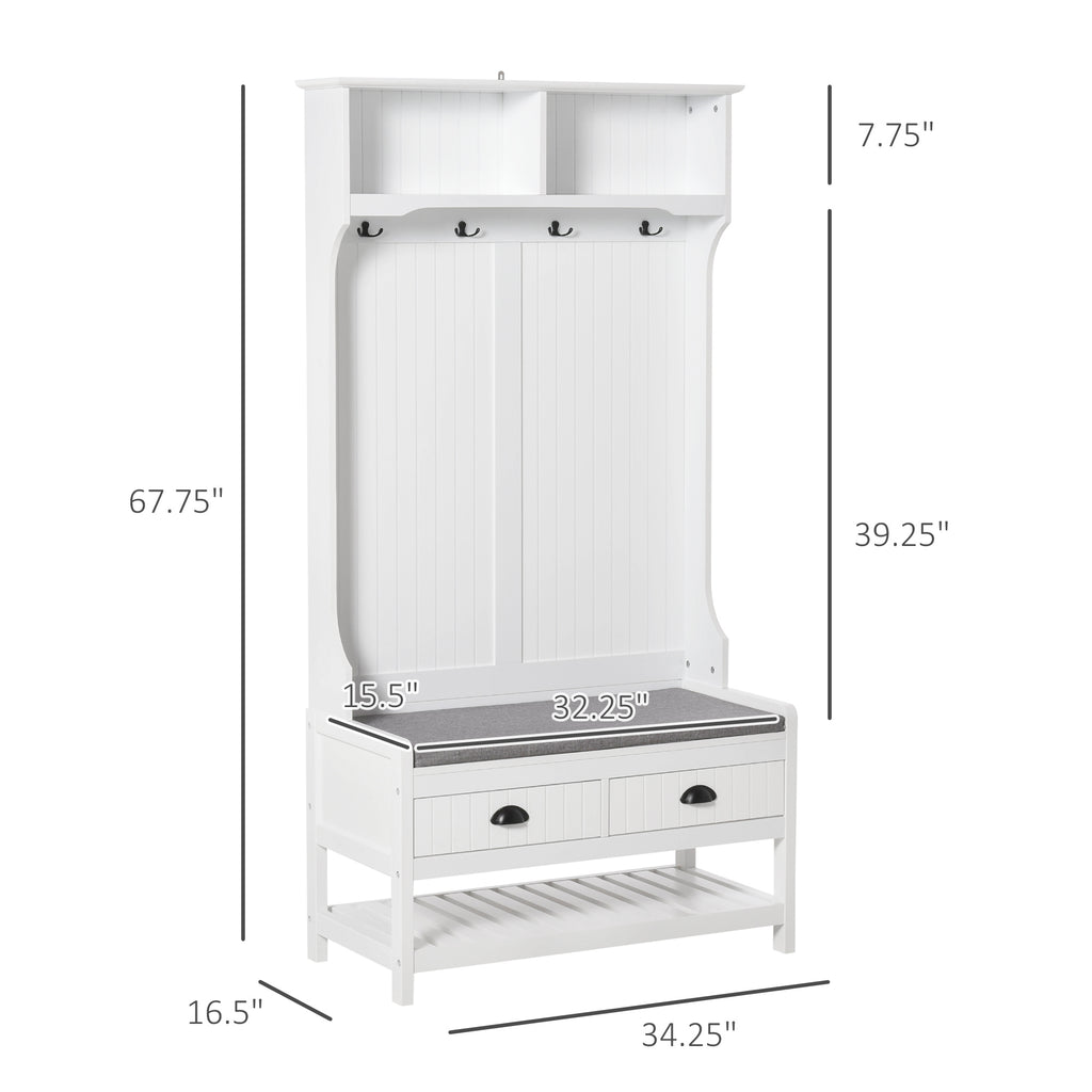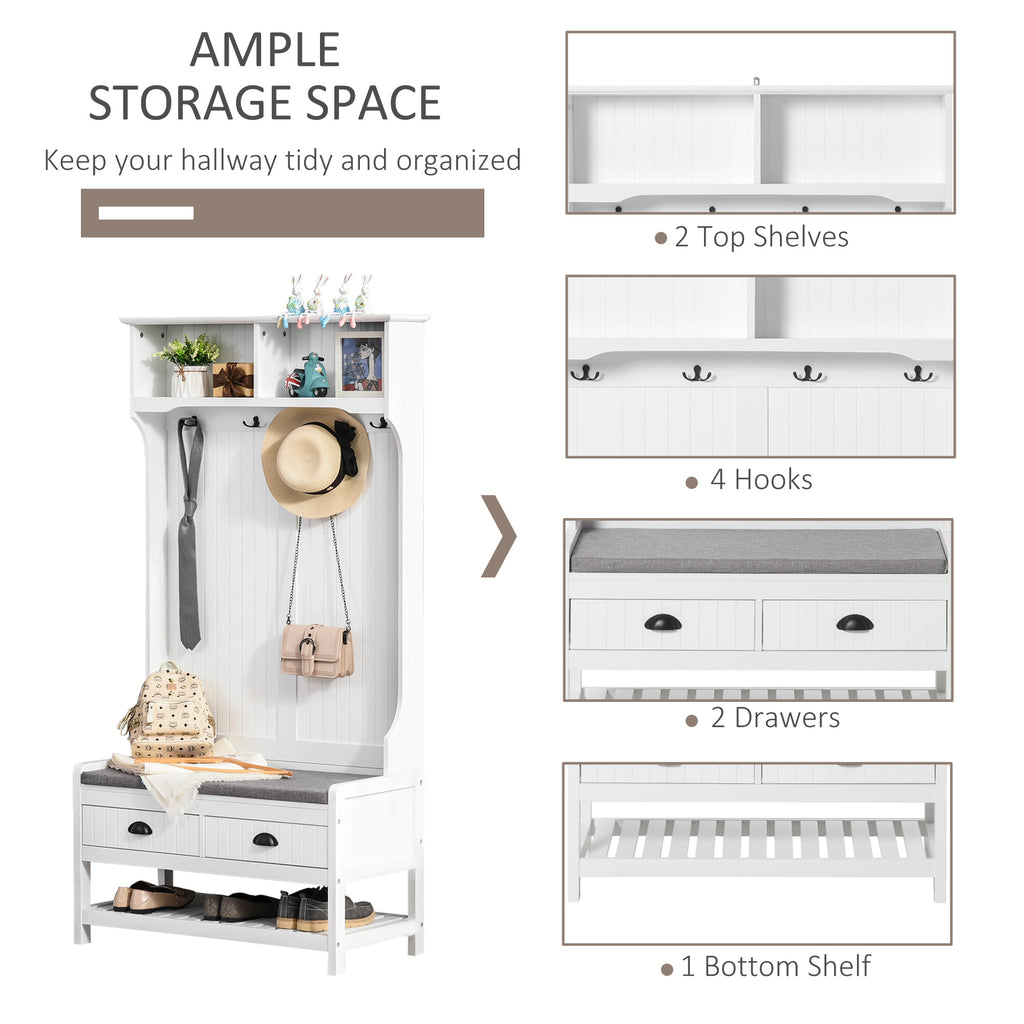 - Multifunctional Design: This hall tree is a great combination of a coat rack, shoe bench, storage shelves, and drawers. This hallway coat rack keeps your bags, coats, shoes, and small items all in one place and offers an attractive yet practical storage solution for your everyday items. The bottom slatted shelf can hold up to 3 pairs of shoes