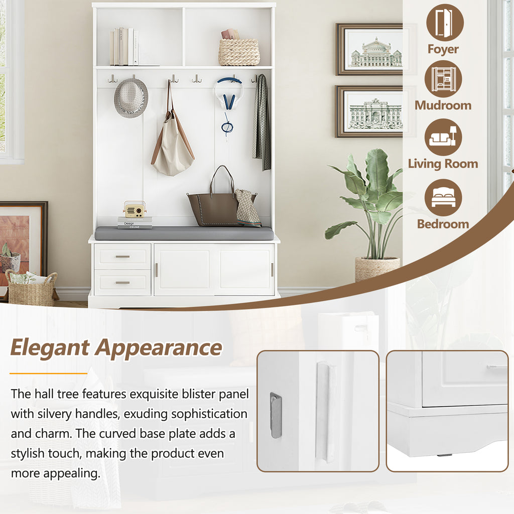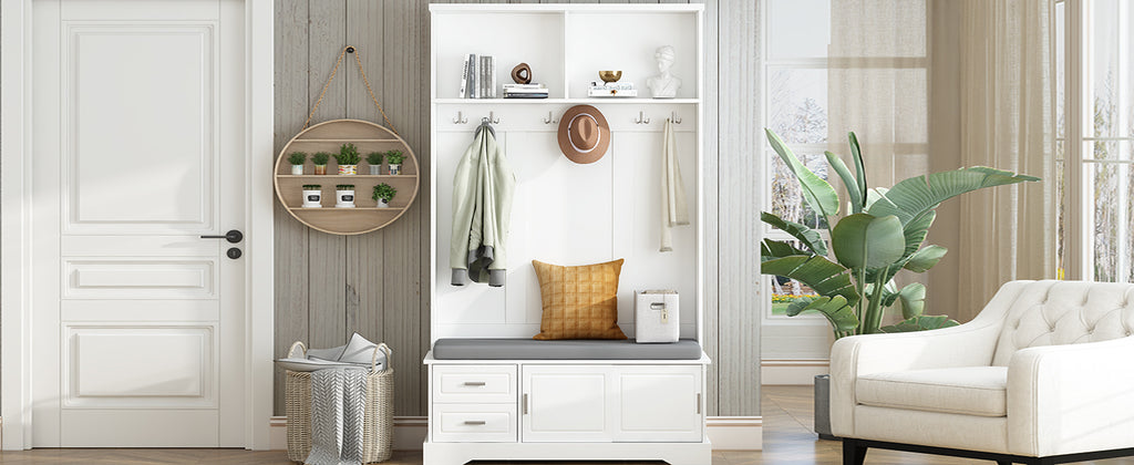 - This hall tree features a generously padded bench that offers a cozy spot to sit while putting on or taking off your shoes. The detachable gray cushion not only facilitates easy cleaning but also ensures a soft and comfortable experience to either begin or end your day.