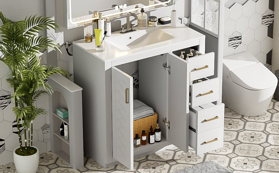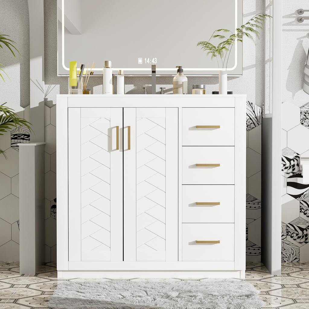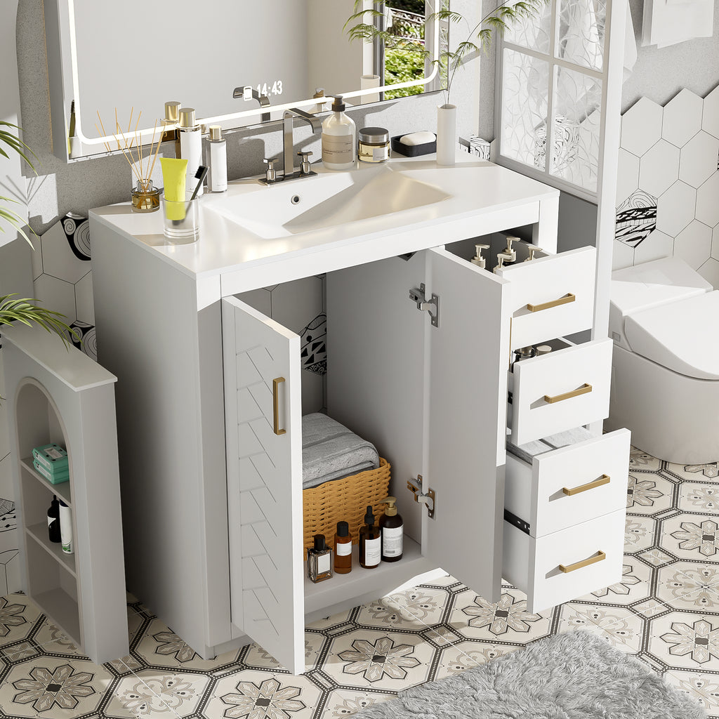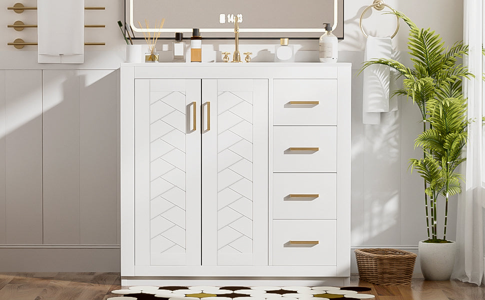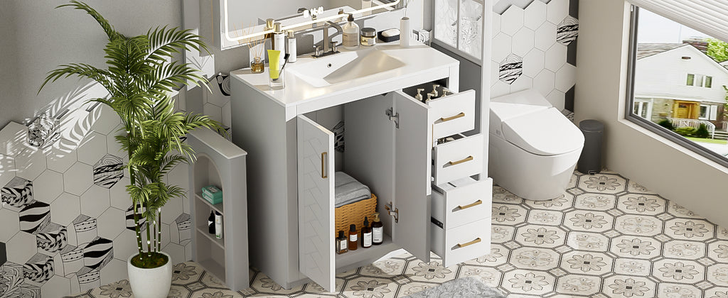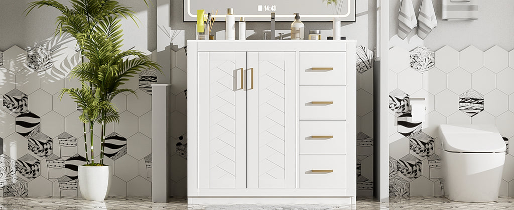 - [ Multi-Purpose Cabinet & Concealed Storage ] Are you looking for stylish and functional storage solutions for your bathroom? Our bathroom vanity provide ample space for all your toiletries and bathroom essentials. The combination of the cabinet body and the drawer perfectly stores all kinds of bathroom products and keeps the necessities away from water stains and dust. Soft-close doors and drawer fronts feature a water-resistant paint finish for durability.
