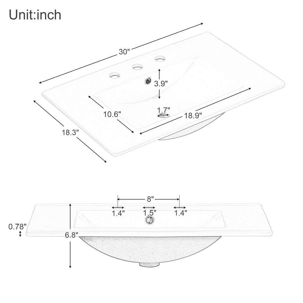 - Ceramic Sink: Made of solid ceramic, this white sink has an overflow and three faucet holes. It is so easy to clean that you can keep it smooth and shinning effortlessly. 8' faucet will fit this sink (not included).