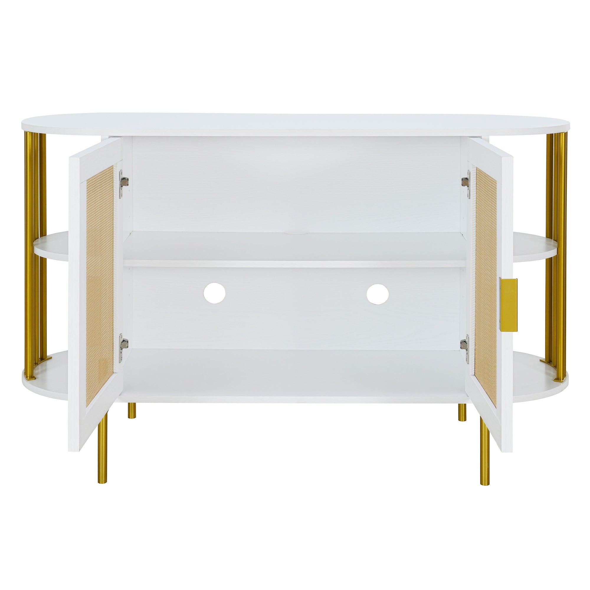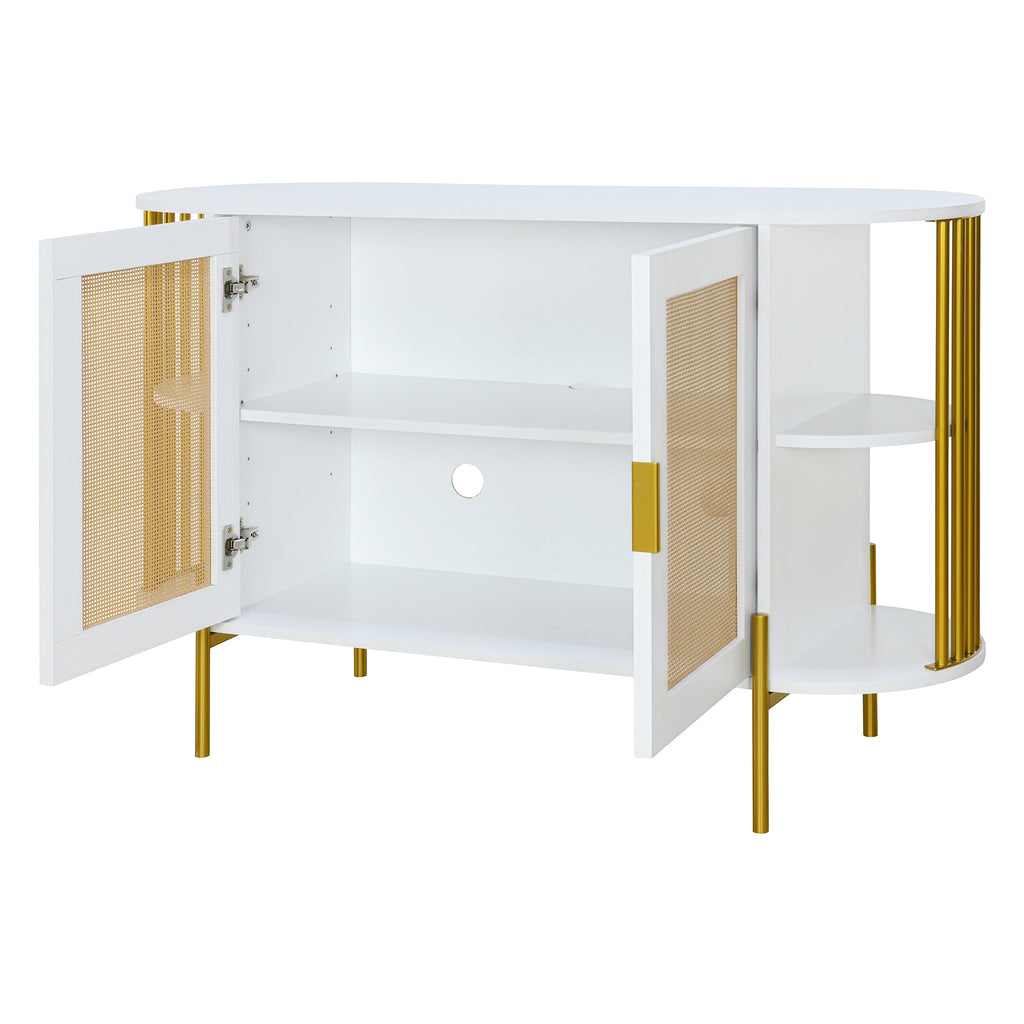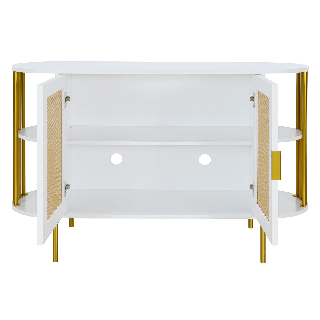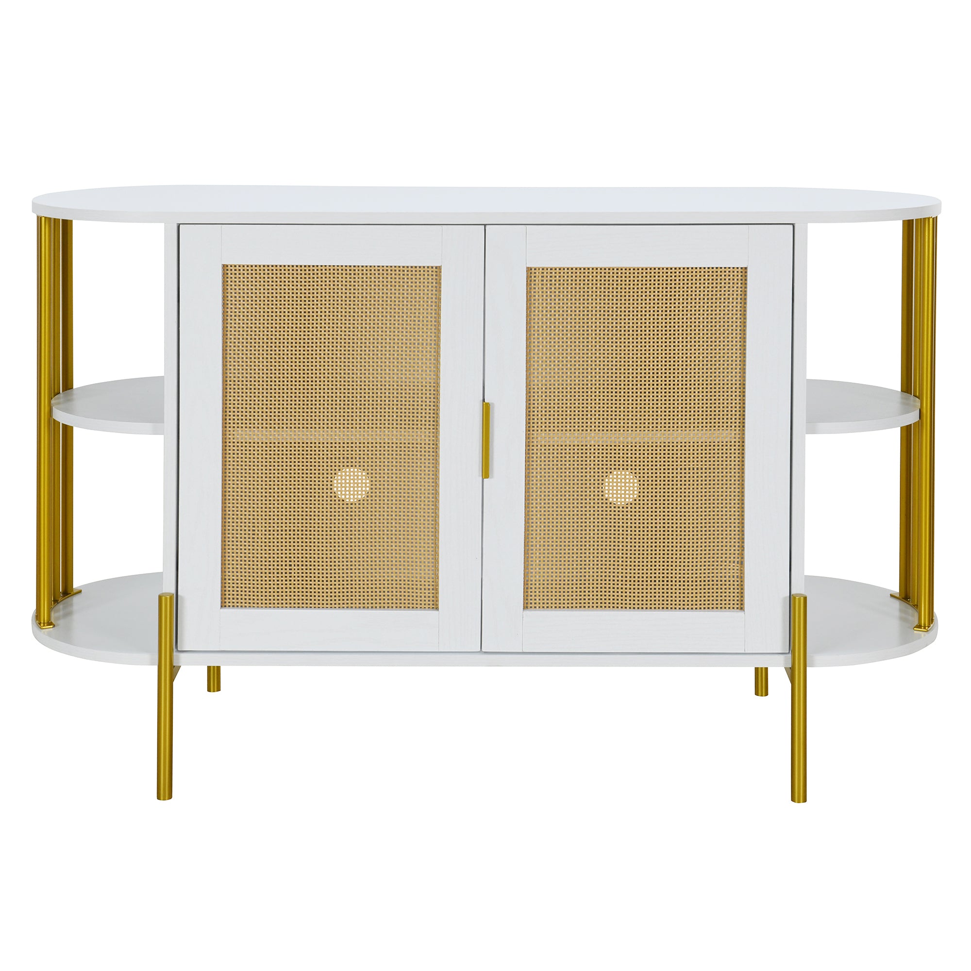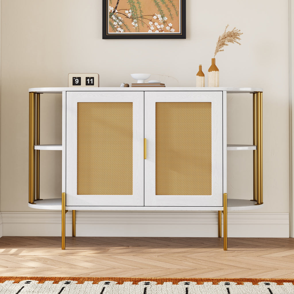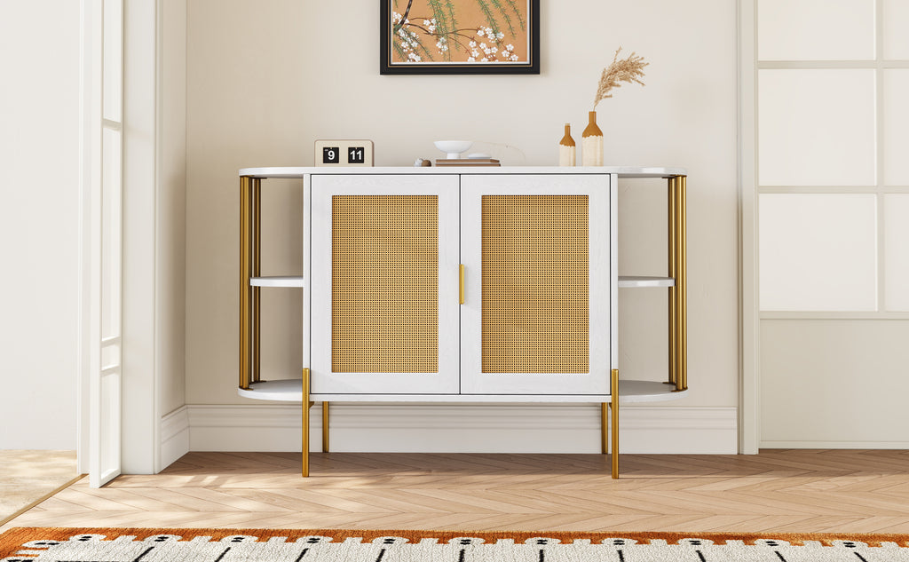 - High-Quality Material: Crafted from premium particleboard, It ensures sturdiness. The two doors feature finely crafted rattan, guaranteeing long-lasting use. The gold handles, legs, and side supports are all power coating, resulting in a smooth surface that not only adds a touch of luxury but also enhances durability and stability. The interior includes an adjustable shelf to meet storage need. Tabletop weight capacity: 331 lbs; Shelves weight capacity: 110 lbs.