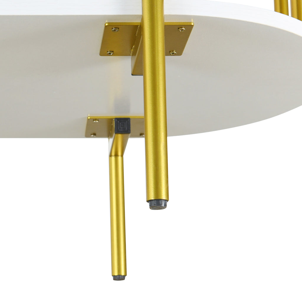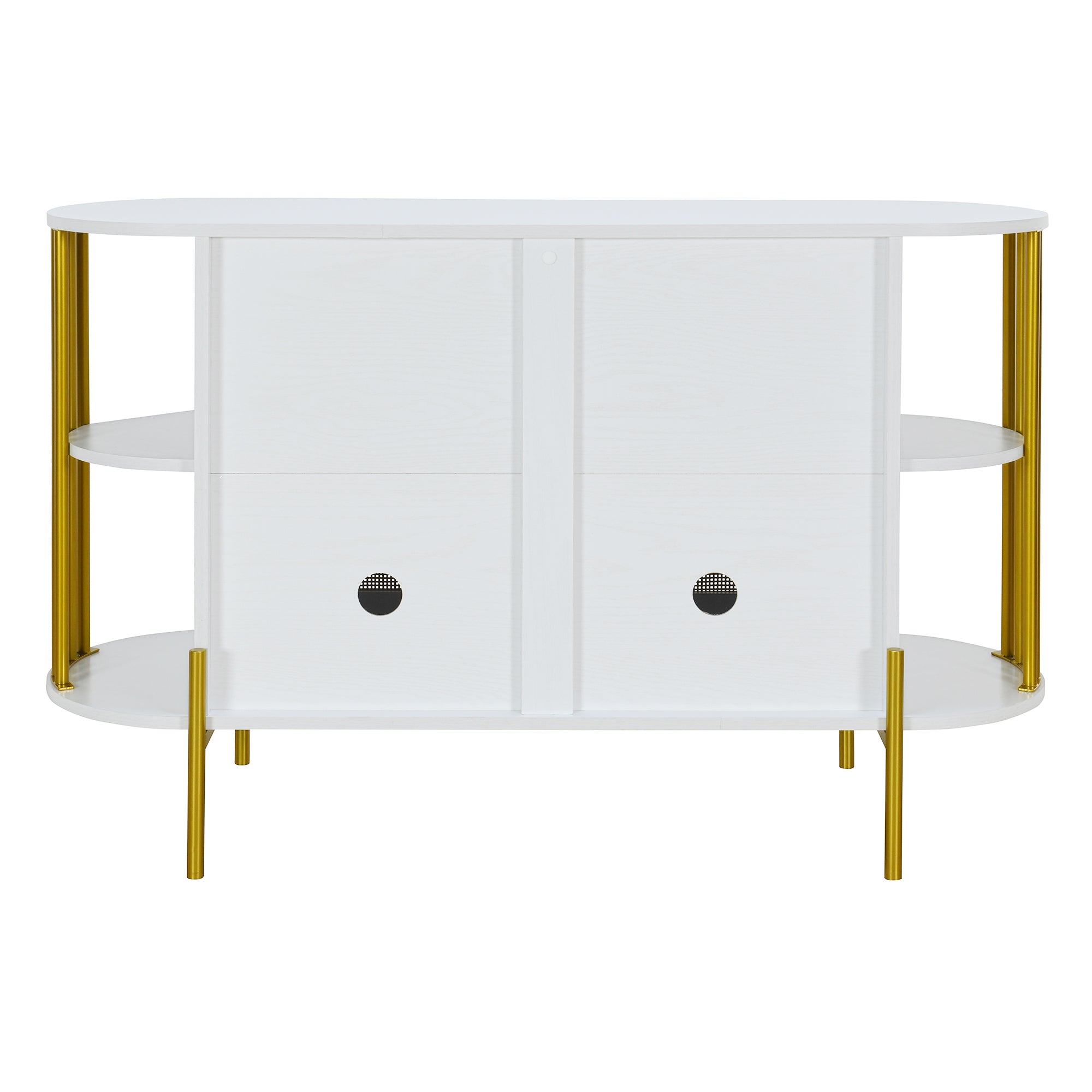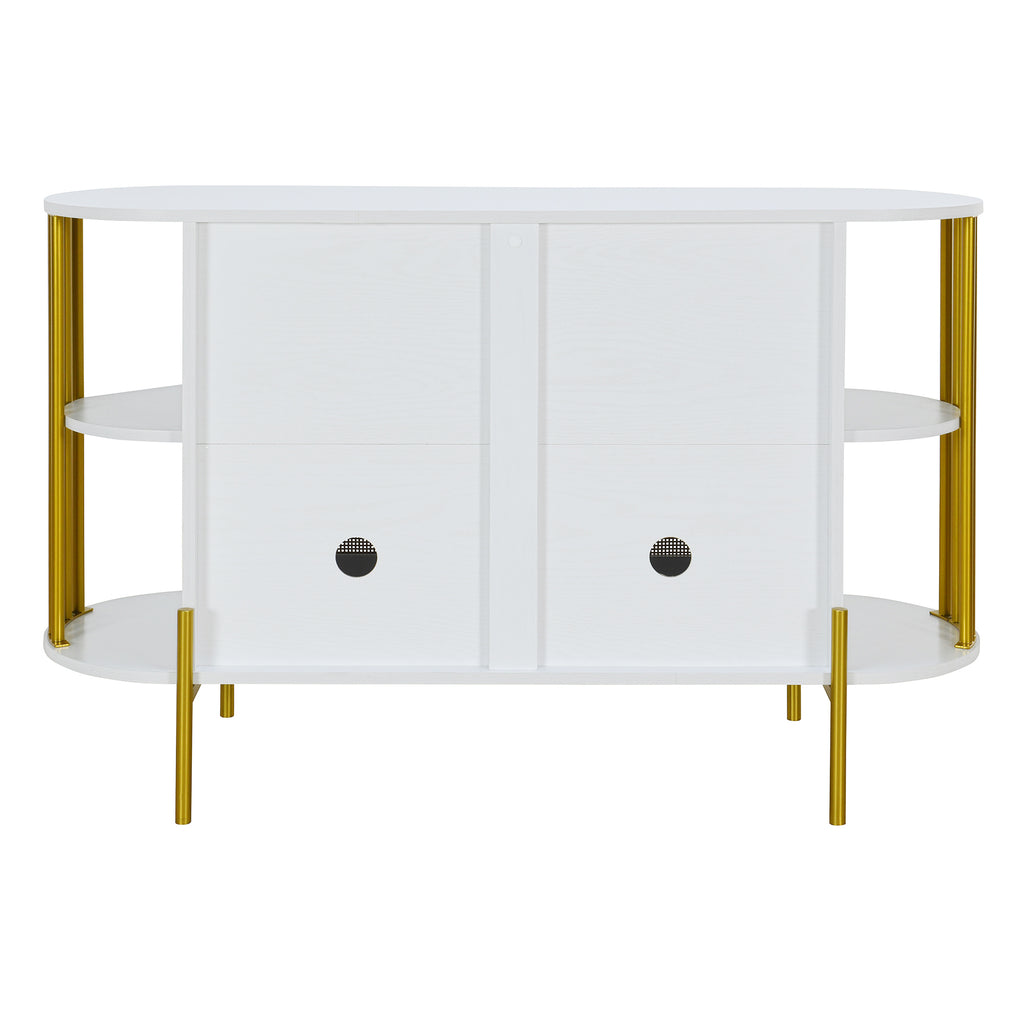 - Thoughtful Details: On both sides of the cabinet are particularly notable, there are elegantly curved open shelves that perfect for displaying smaller items or keeping everyday essentials within easy reach. The gold vertical bars that support the shelves add a touch of sophistication and reinforce the luxurious feel. The legs are equipped with foot pads to protect floors from scratches and provide stability. Curved shelves weight capacity: 47 lbs.
