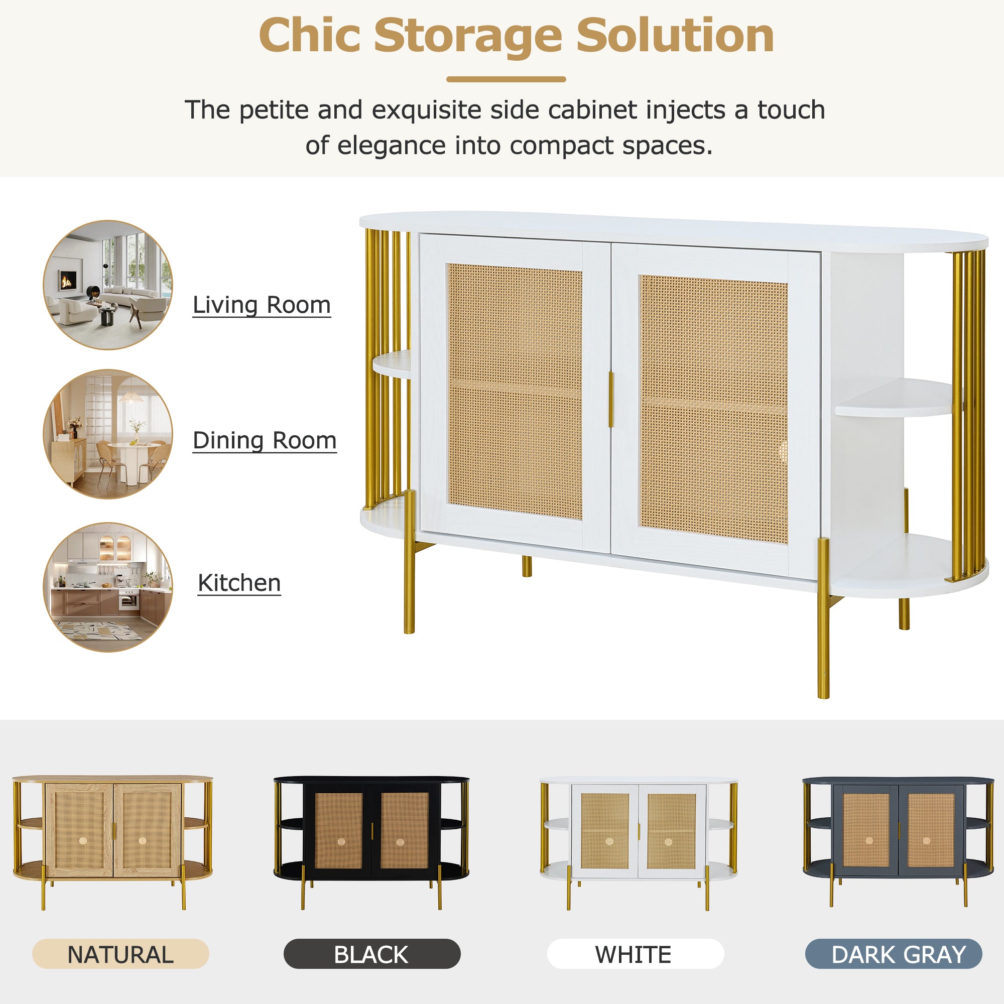 The overall structure of the cabinet is refined, featuring smooth curved lines and rounded corners that create a soft and harmonious visual effect, allowing it to integrate seamlessly into various interior decor styles. The doors are adorned with woven rattan texture, which not only enhances the visual layering but also brings a hint of natural charm to the overall design. The sideboard comes in three stunning colors: black, natural, and dark gray and white.