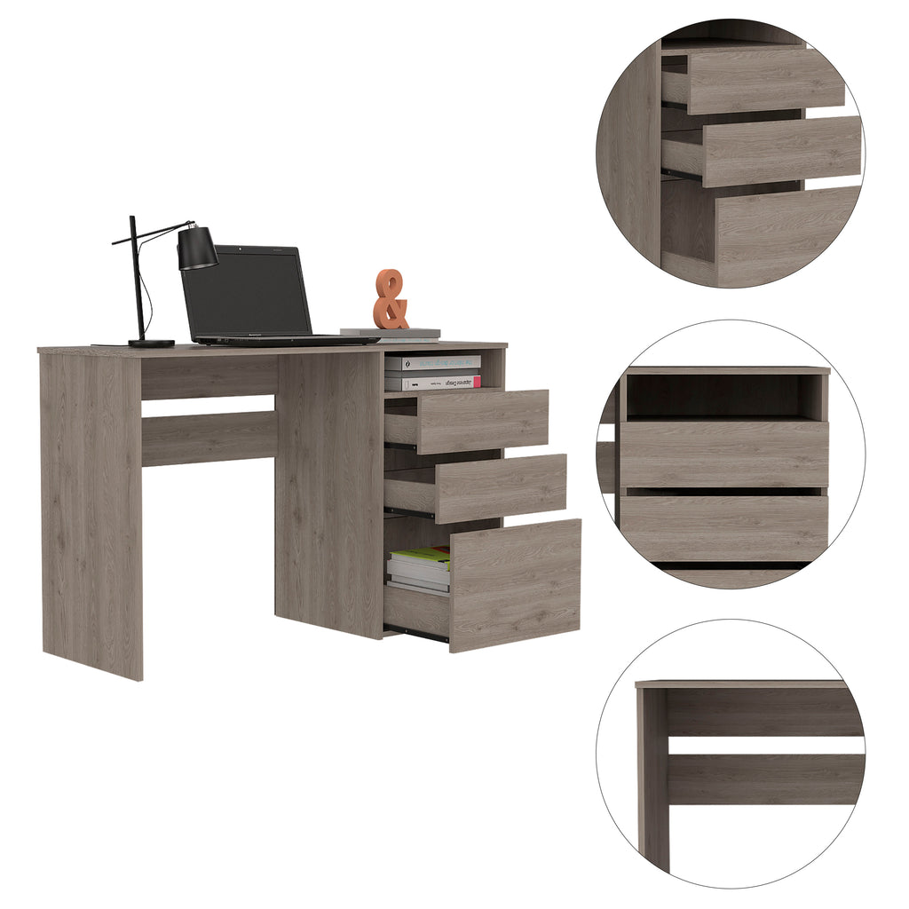 'Simple, practical, elegant, light, and very modern, these words describe this beautiful office or home desk, which is very ergonomic and does not take up more space than necessary, perfect for small but stylish places, excellent for people looking for cleanliness and simplicity in a product. It has three storage drawers where you can accommodate books, notebooks, files, and more, also has a small shelf to accommodate accessories you want to have on hand for greater efficiency. The Louisiana computer desk is a classic piece that will cover your back when it comes to today's needs of remote learning or working from home. Standing at 29.5'' inches high and 47.5'' wide, this desk is perfect and has a straightforward design for spaces with limited space available. Featuring three spacious drawers and one shelf is ideal for keeping things neat and organized while you work or study. It is made of engineered wood in a light Gray finish. dimensions are 47.5 W x 16.5 D x 29.7 x 16.5D'